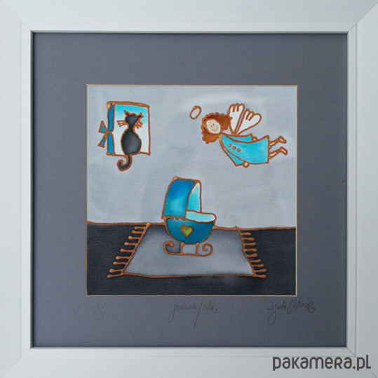 Piękna, namalowana na naturalnym jedwabiu miniatura (25x25cm) - przedstawiająca aniołka stróża przy szarej kołysce. Obrazek oprawiony w passe-partout z kremowego kartonu, opatrzony sygnaturą i certyfikatem pochodzenia. Całość uzupełnia drewniana rama o kolorze orzechowym. Moje anioły są prawdziwymi stróżami, każdy, który urodzi się w mojej pracowni jest inny i może by stróżem tylko jednej osoby. Dlatego wewnątrz pięknego, kartonowego opakowania/koperty umieszczam dedykację dla tej jedynej, obdarowanej aniołem osoby. Aniołek staje się w ten sposób idealną pamiątką na specjalną okazję: ślub, chrzest, rocznicę. Treść dedykacji do uzgodnienia.