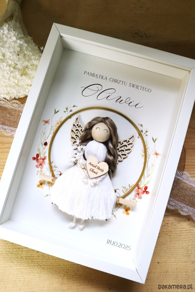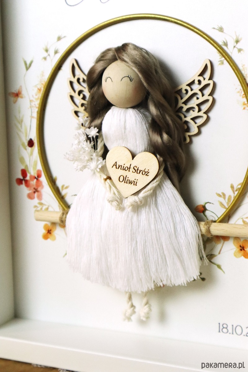 Anioł Stróż z makramy w ramce na Chrzest Komunię Roczek
