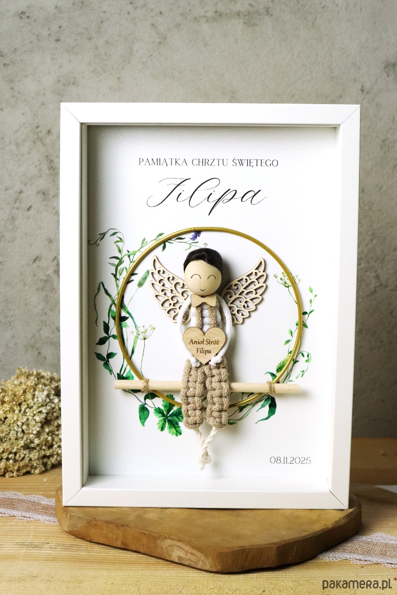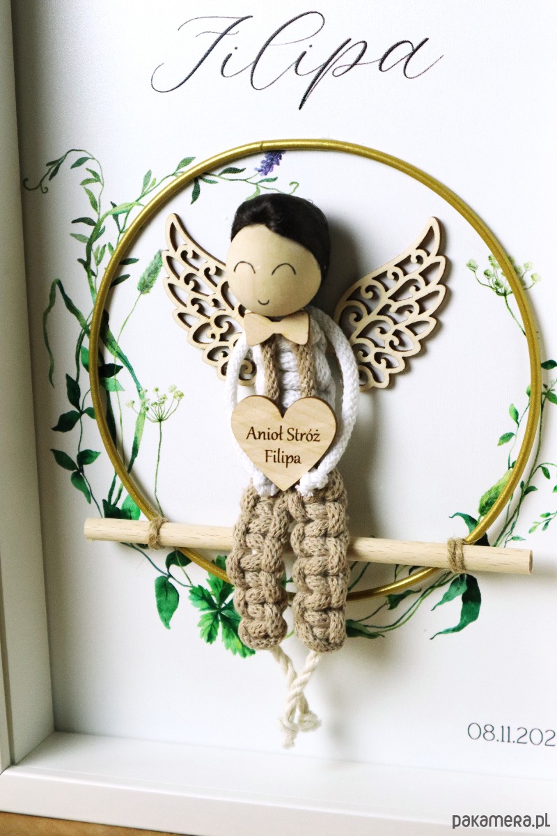 Anioł Stróż z makramy w ramce na Chrzest Komunię Roczek