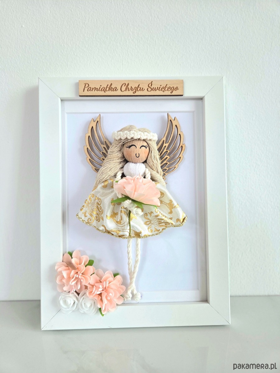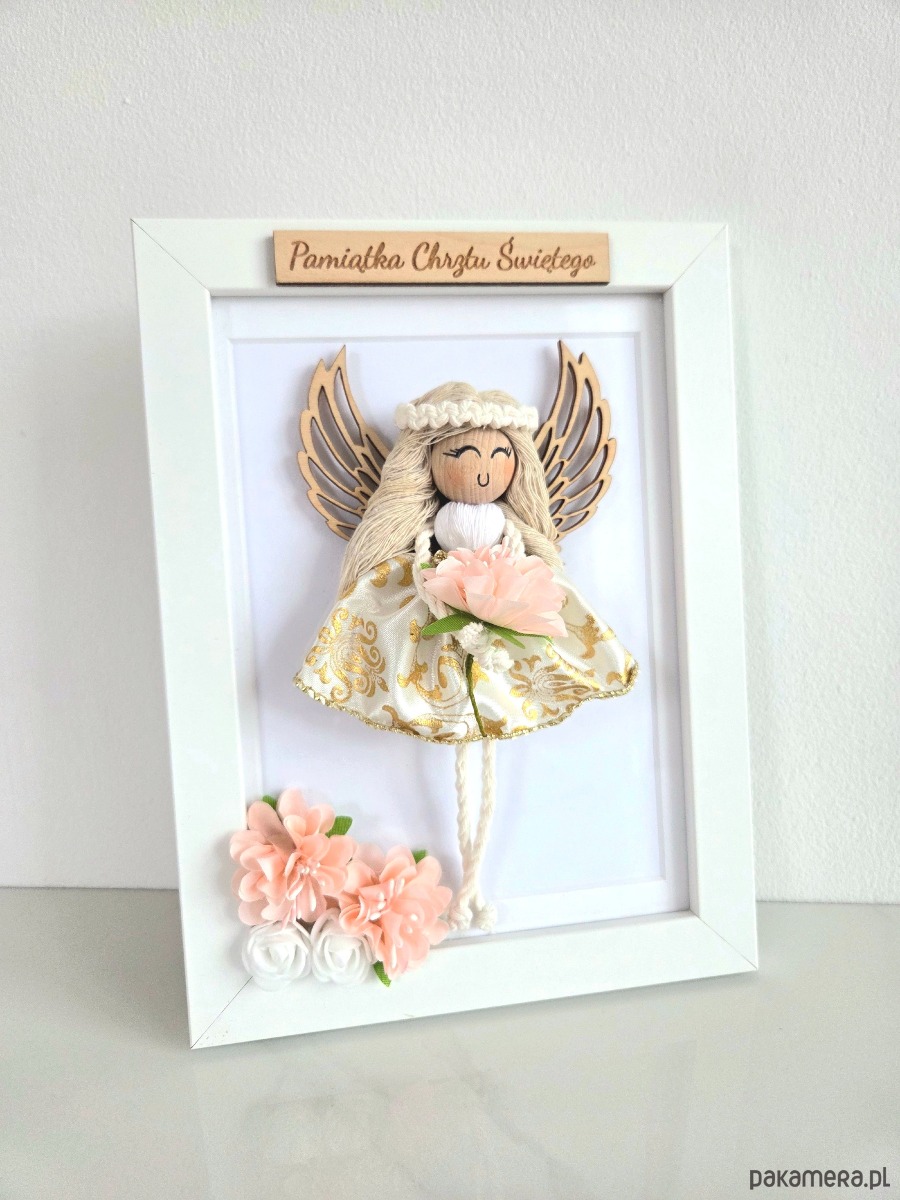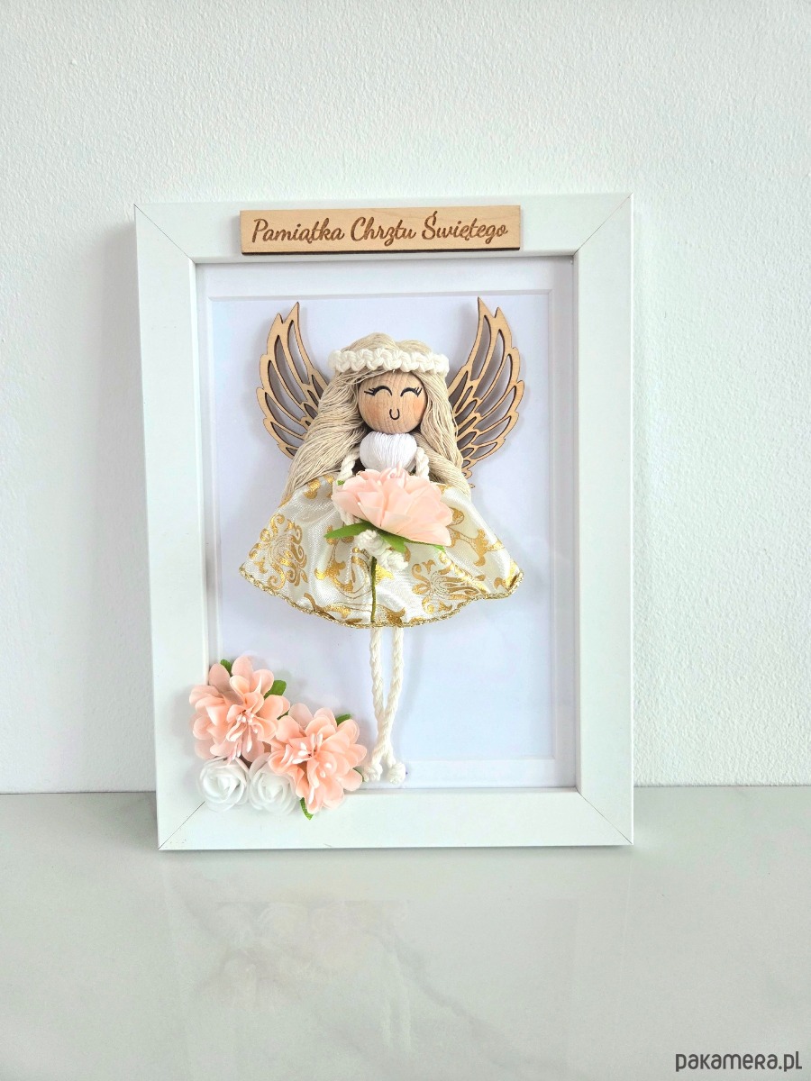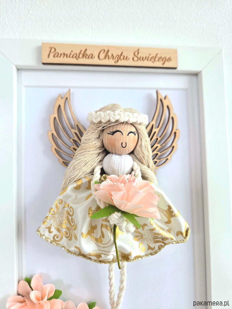 Aniołek został starannie wykonany ze sznurka bawełnianego, ubrany w sukienkę. W rękach trzyma kwiat. Umieszczony w ramce wypełnionej kwiatami. Dodatkowo na górze ramki znajduje się drewniana tabliczka z grawerem: Pamiątka Chrztu Świętego.