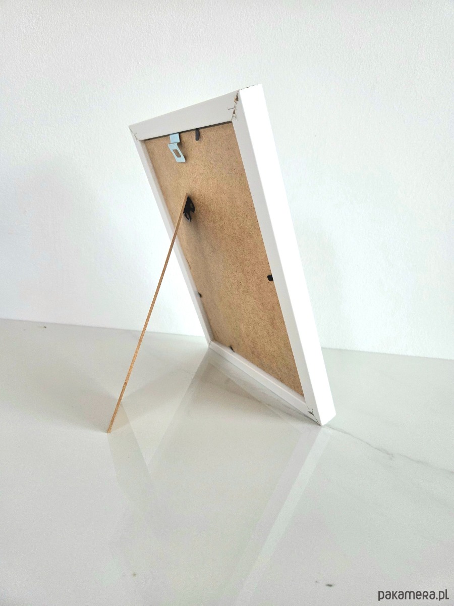 Ramka w kolorze białym ma możliwość powieszenia na ścianie jak i postawienia jej.