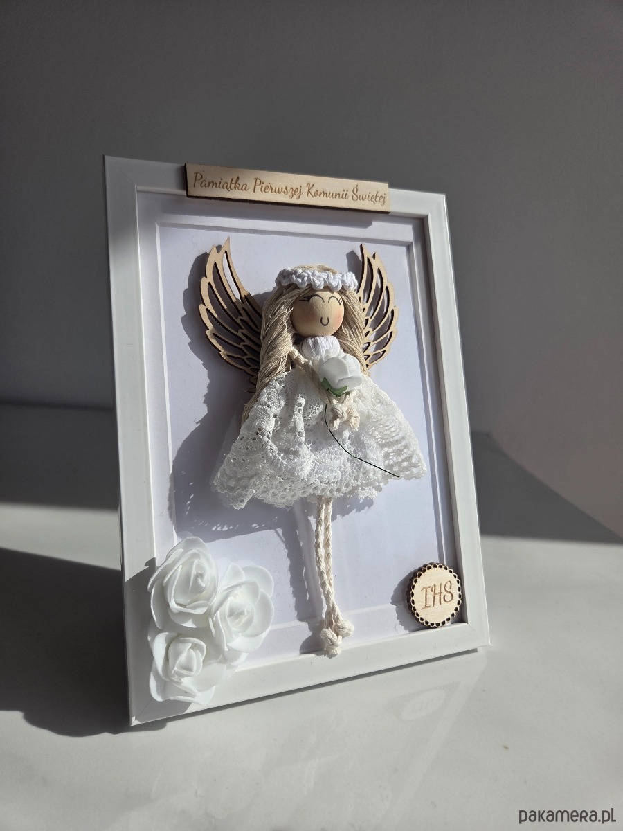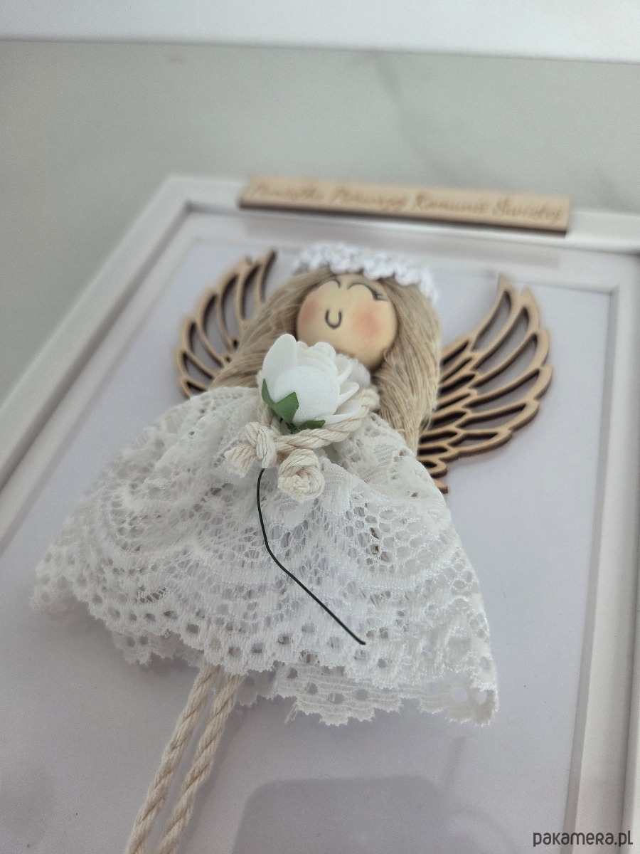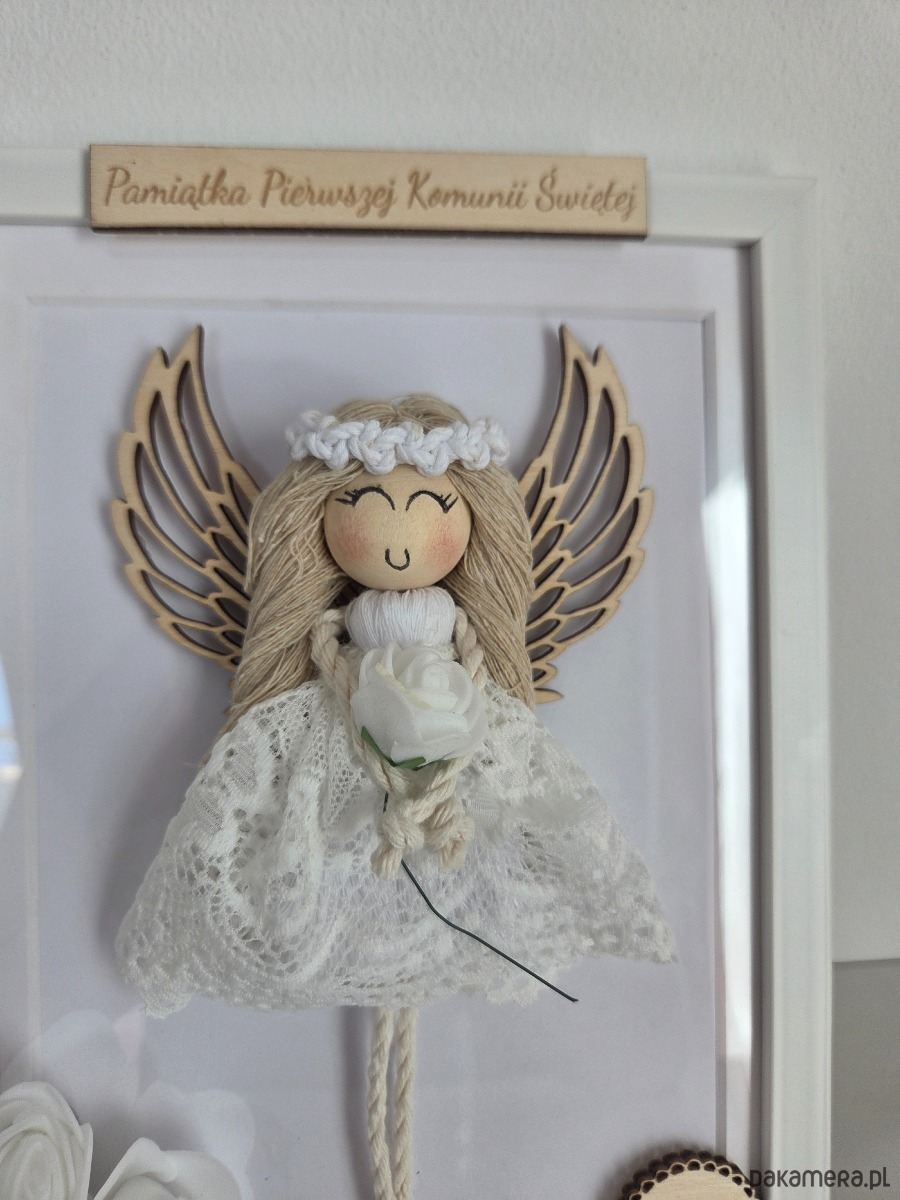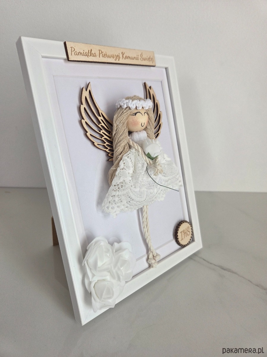 Aniołek wykonany jest z wysokiej jakości bawełnianego sznurka makramowego i ubrany w subtelną koronkową sukienkę. W dłoniach trzyma kwiat, a całość została umieszczona w eleganckiej białej ramce ozdobionej kompozycją kwiatową, która pięknie prezentuje się w każdym wnętrzu.