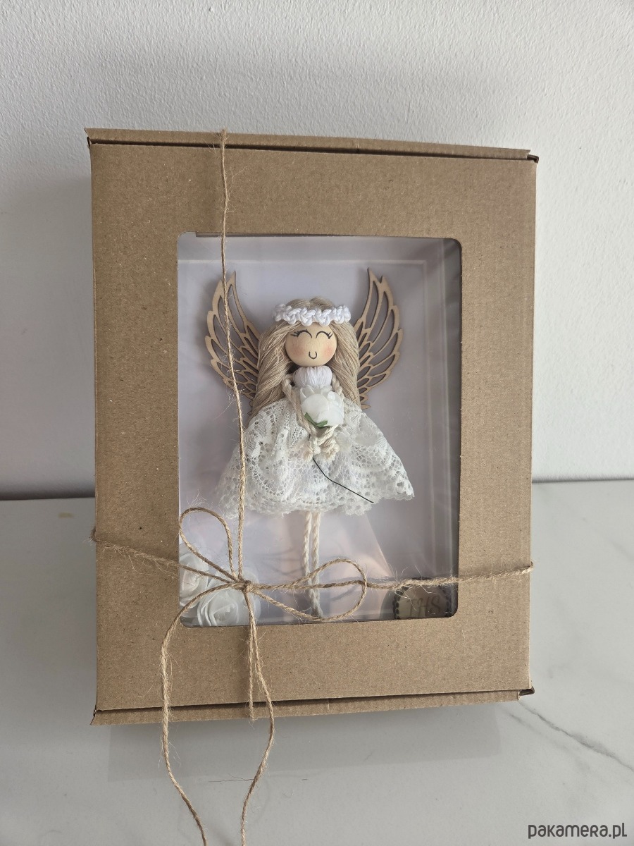 Aniołek jest starannie zapakowany w pudełko z okienkiem i przewiązany sznurkiem jutowym, dzięki czemu jest od razu gotowy do wręczenia.