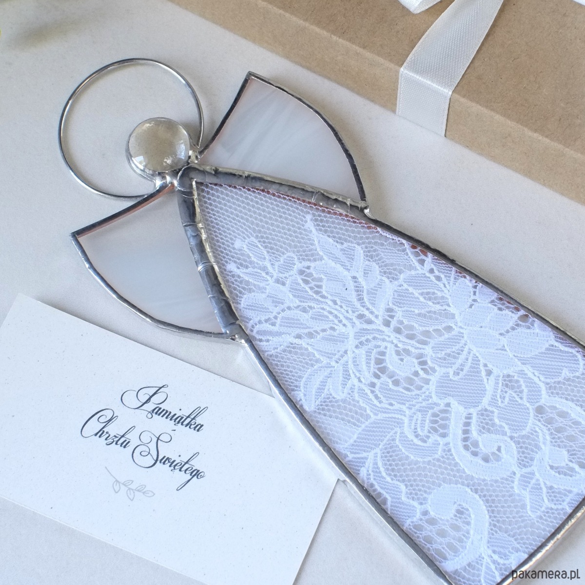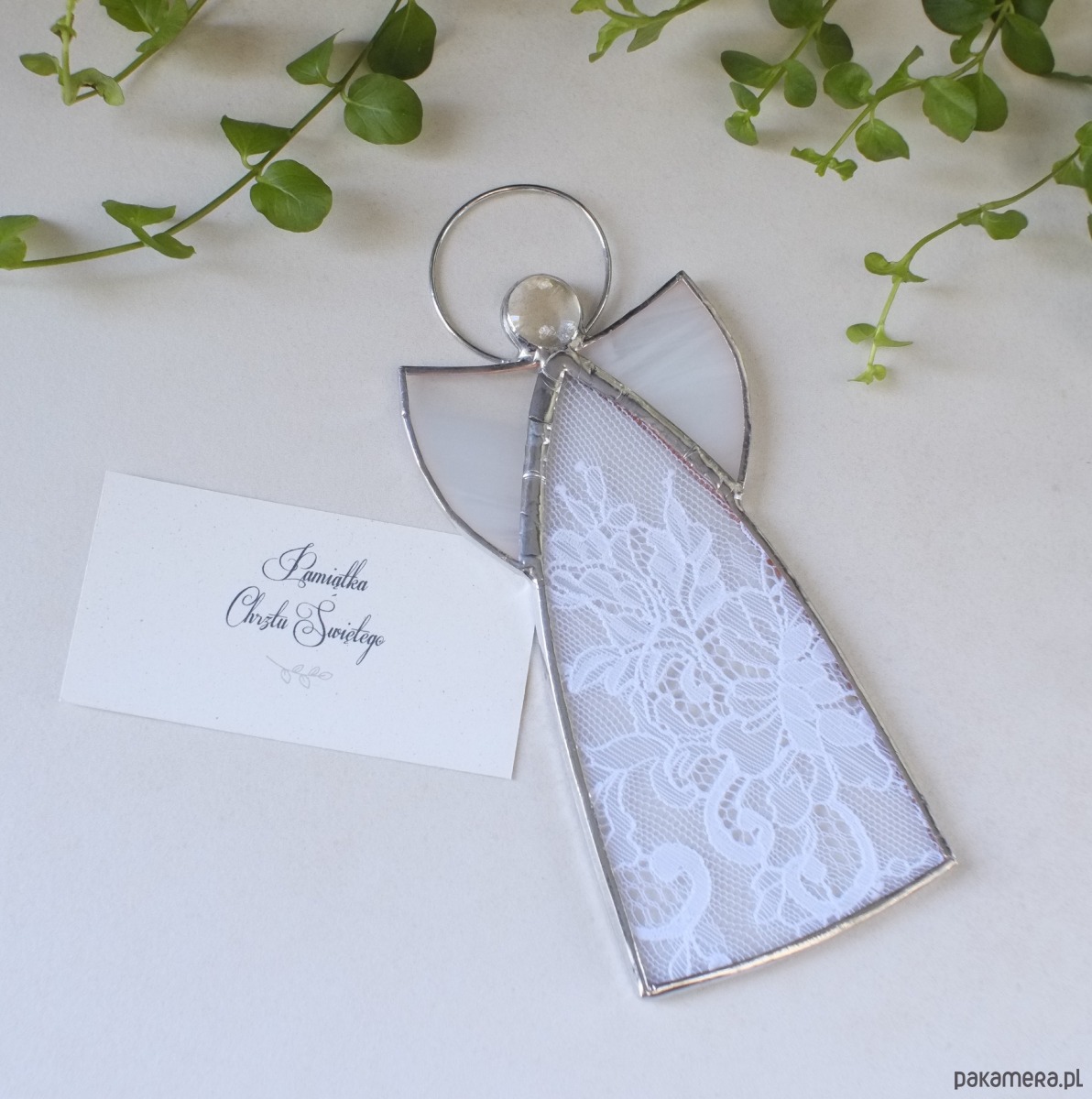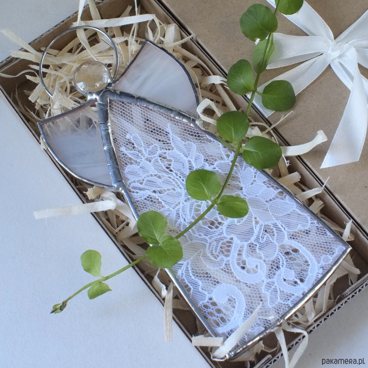 Anioł witrażowy z przepiękną, francuską białą koronką - do zawieszenia na ścianie!