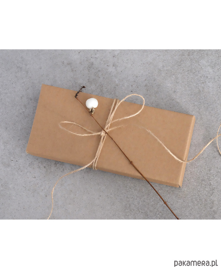 Anioł jest pięknie zapakowany w pudełko z ekologicznej, brązowej tektury, wyłożone ozdobnym siankiem, przewiązane białą wstążką lub sznurkiem.