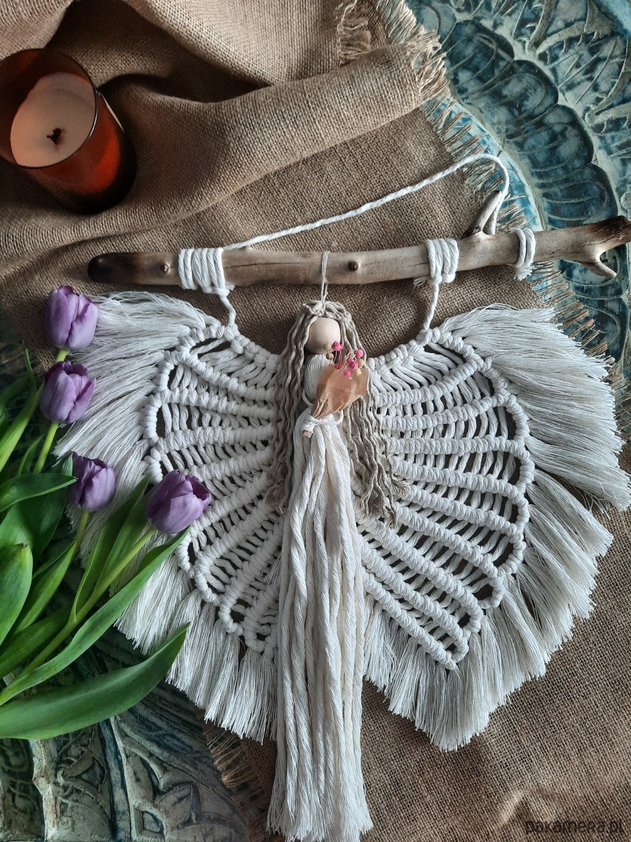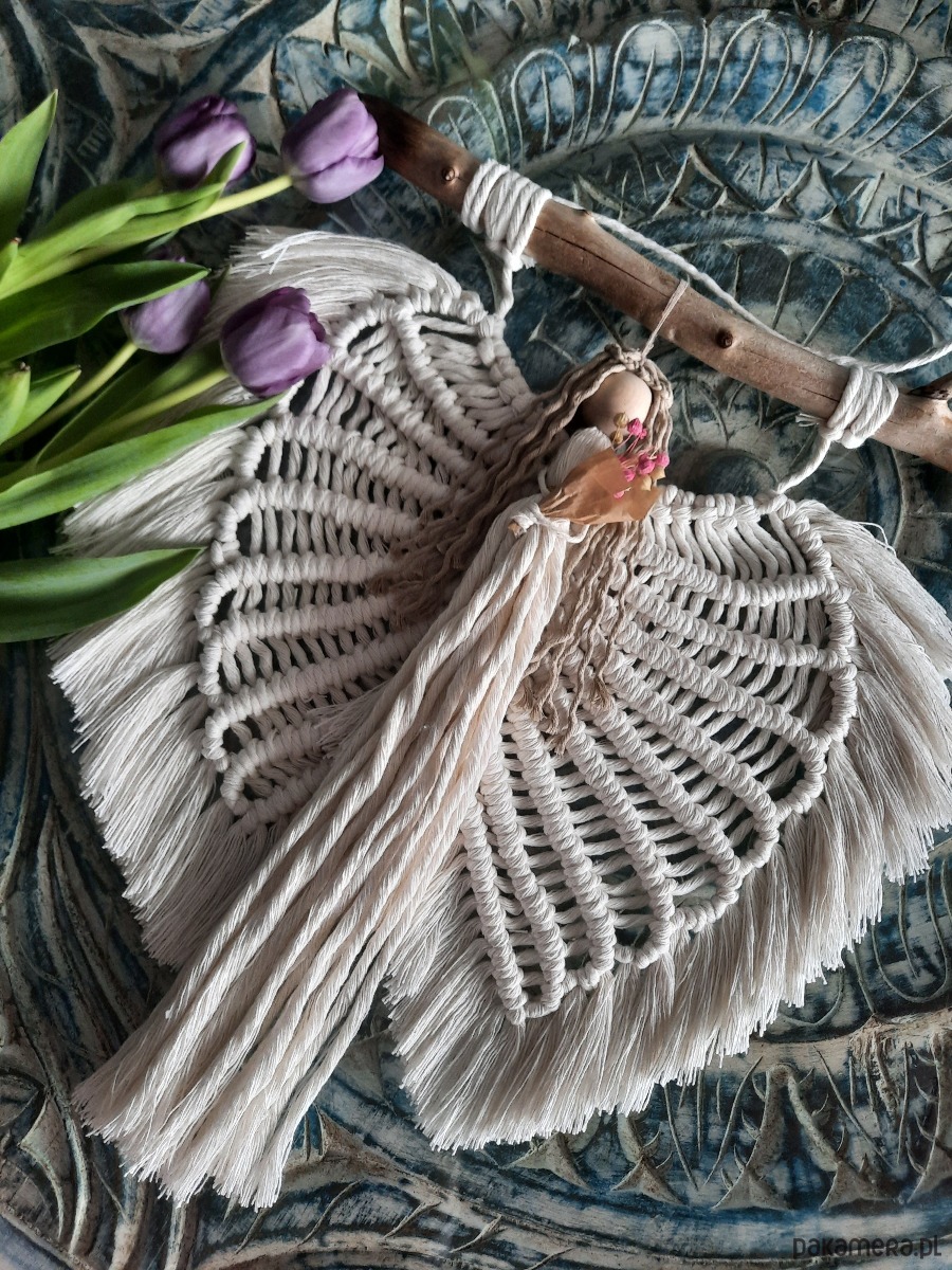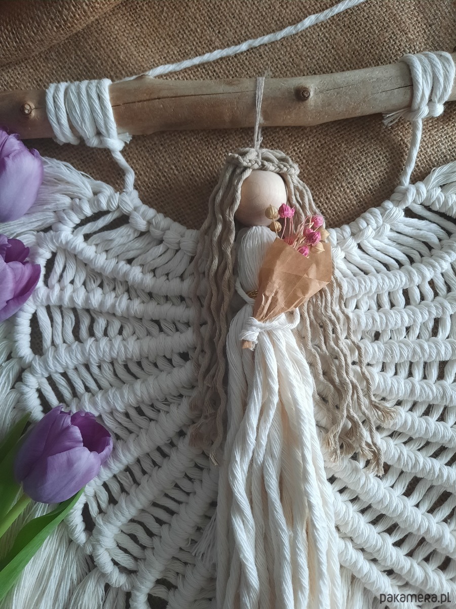 Anioł z pięknymi skrzydłami wykonany techniką makramy.