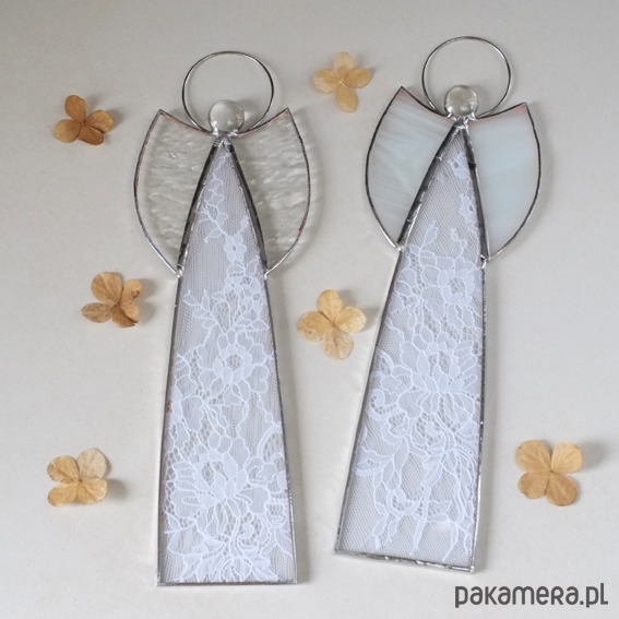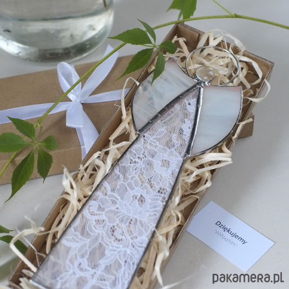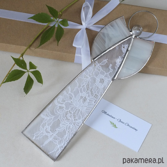 Wyjątkowy prezent na Chrzest, Komunię, Ślub - pięknie zapakowany anioł witrażowy z przepiękną, francuską koronką w kolorze białym!