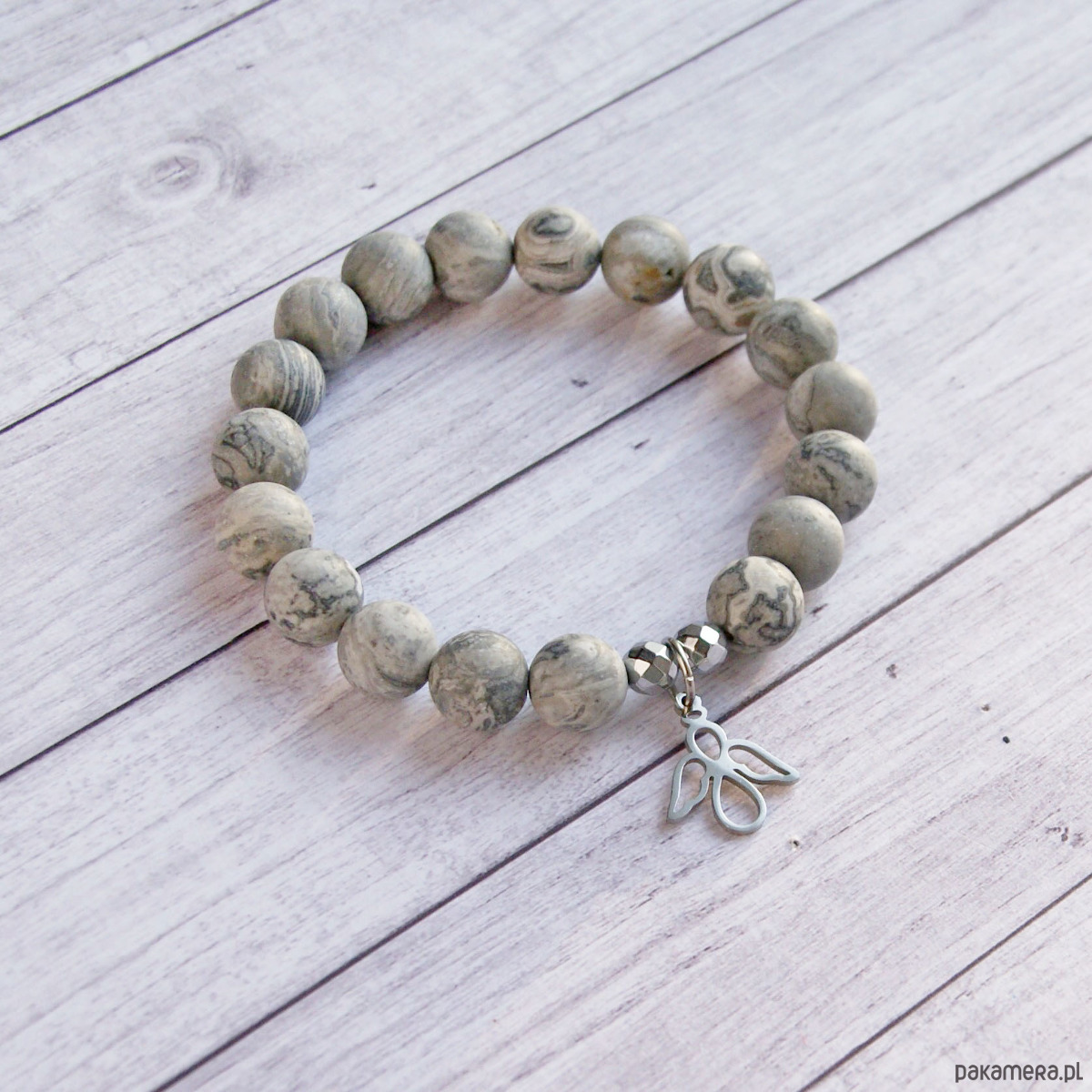 TUTAJ: urocza, anielska bransoletka. wykonana z kul szarego jaspisu (10mm), kul fasetowanego hematytu i zawieszki ze STALI SZLACHETNEJ (nie uczula, kolor nie ściera się).... kamienie na solidnej lince elastycznej....