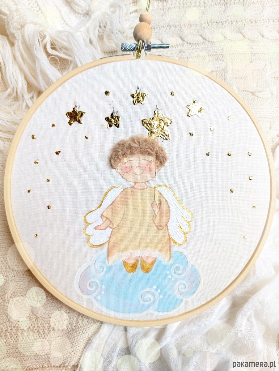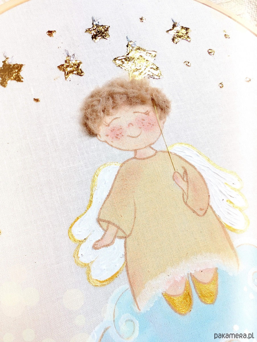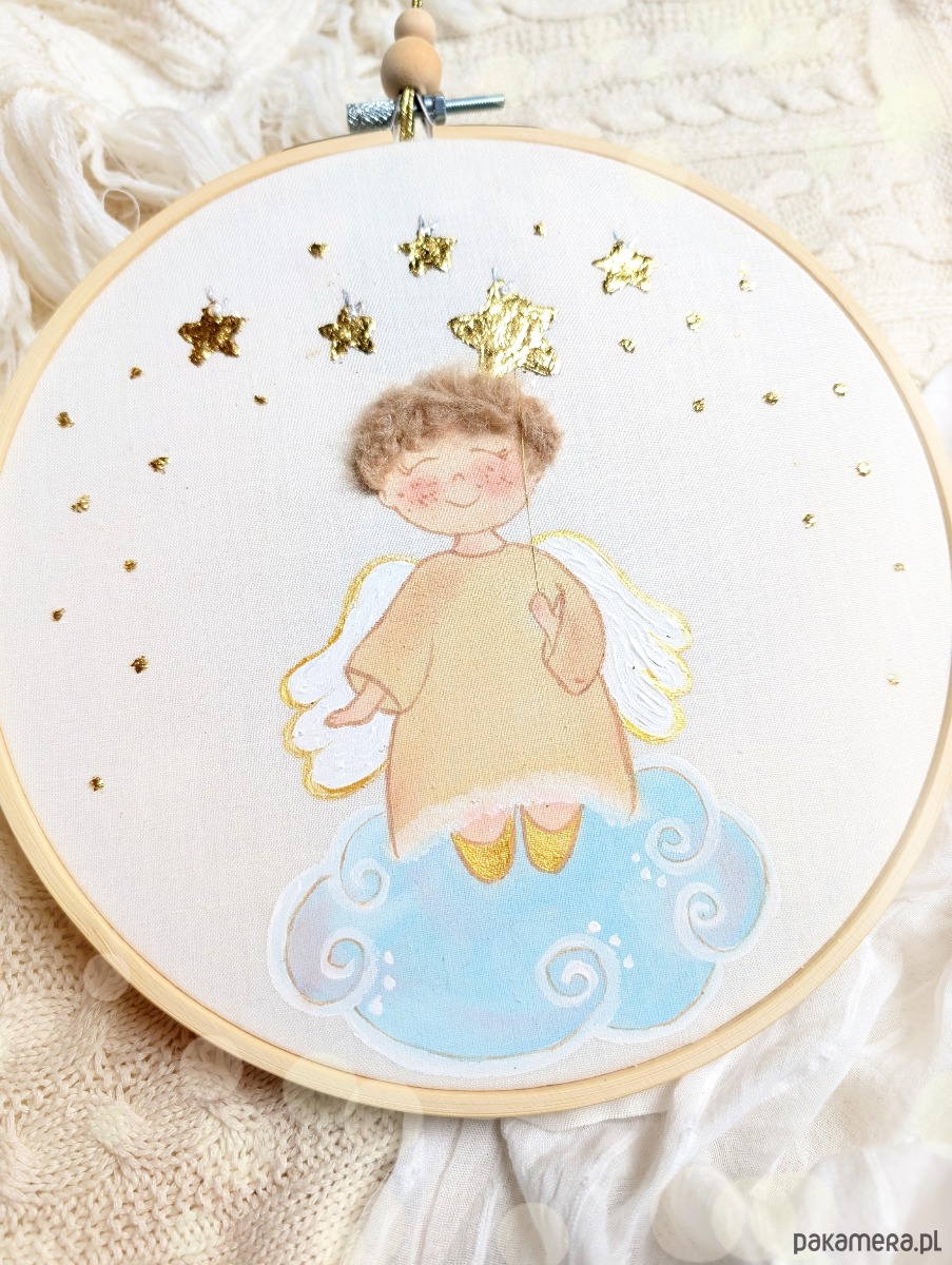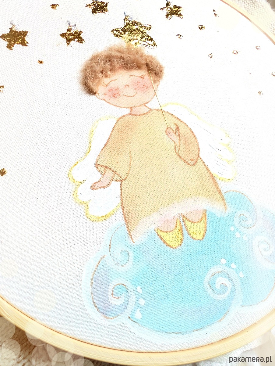 Anioł został namalowany farbami akwarelowymi na płótnie bawełnianym.