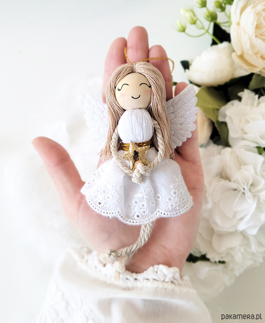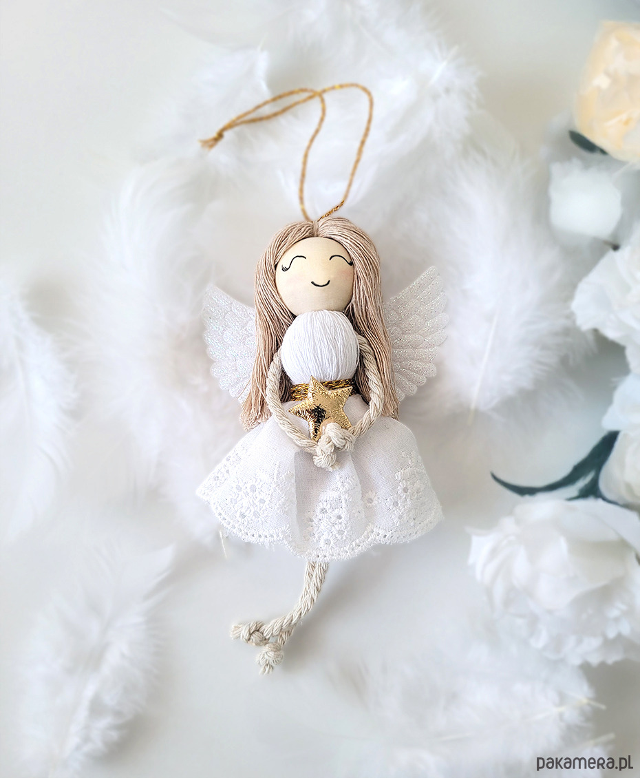 Uroczy Aniołek makramowy na choinkę lub do stroiku z białymi brokatowymi skrzydełkami.