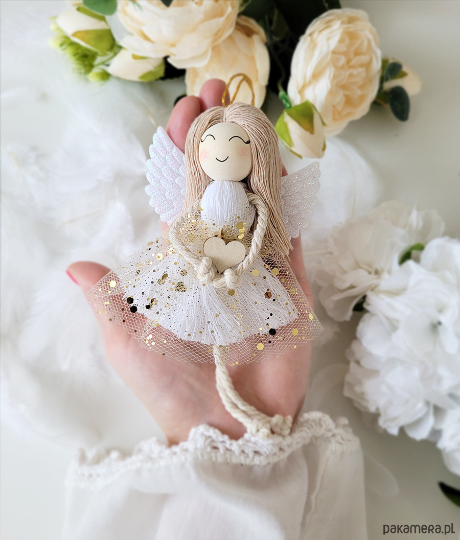 Uroczy Aniołek makramowy na choinkę lub do stroiku z białymi brokatowymi skrzydełkami.