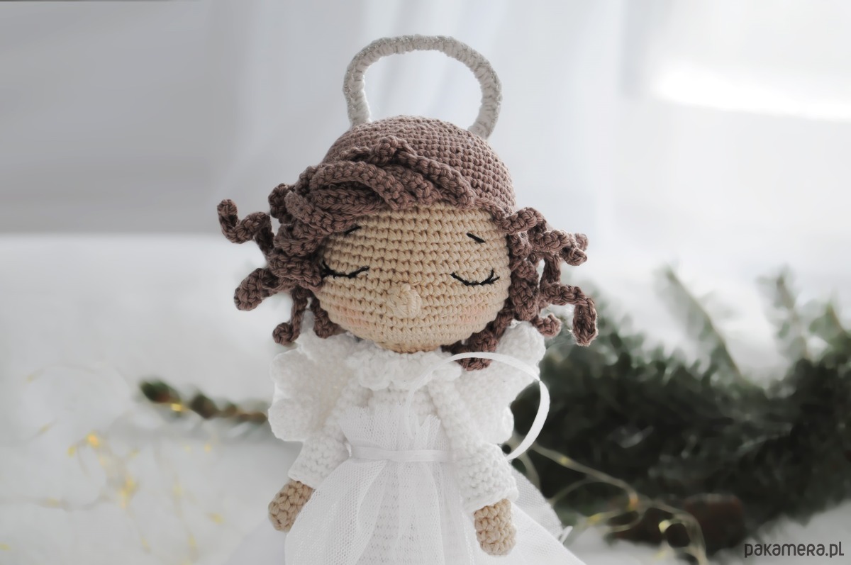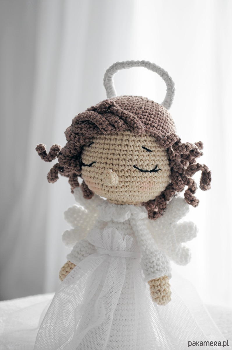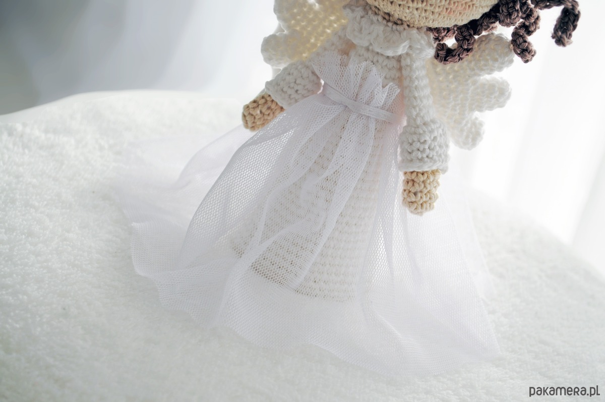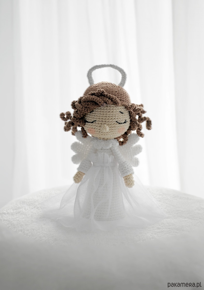 Aniołek ma ok. 17cm wzrostu (bez aureoli). Może przycupnąć na półeczce koło łóżka, pilnując dobrych snów, lub zawisnąć w dowolnym kąciku w pokoju dziecka. Będzie też idealnym prezentem na chrzest, święta, komunię czy urodziny.