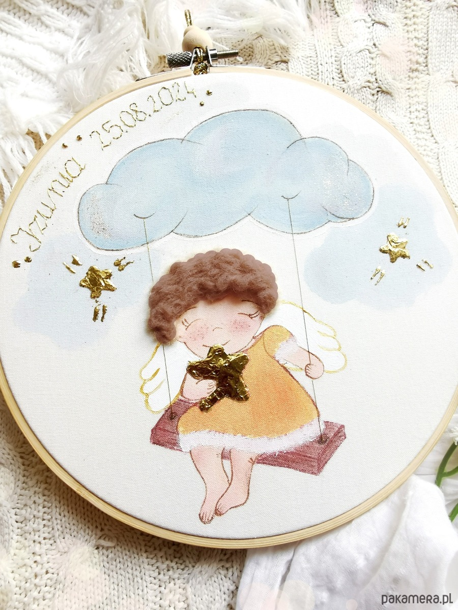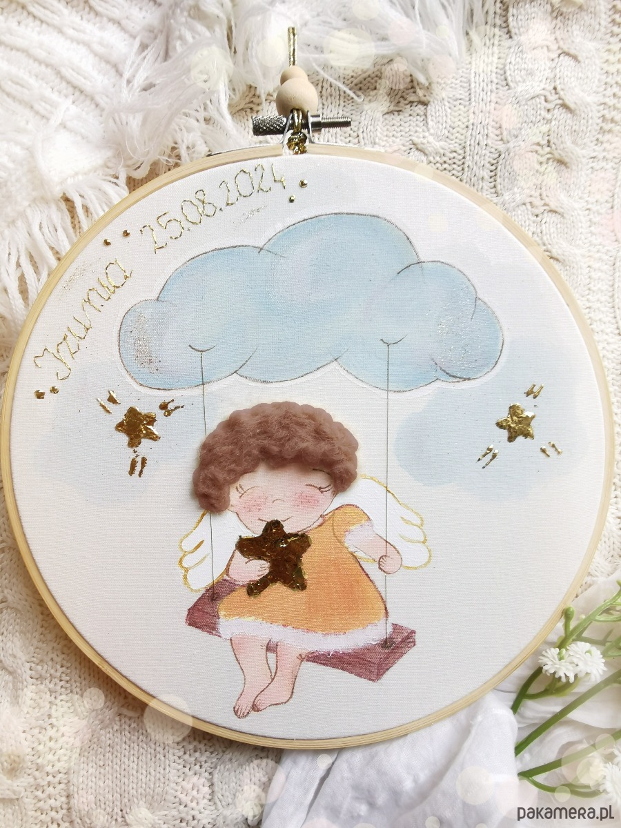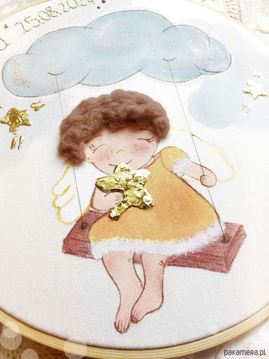 Aniołek na huśtawce, obrazek na pamiątkę Chrztu/ narodzin dziewczynki