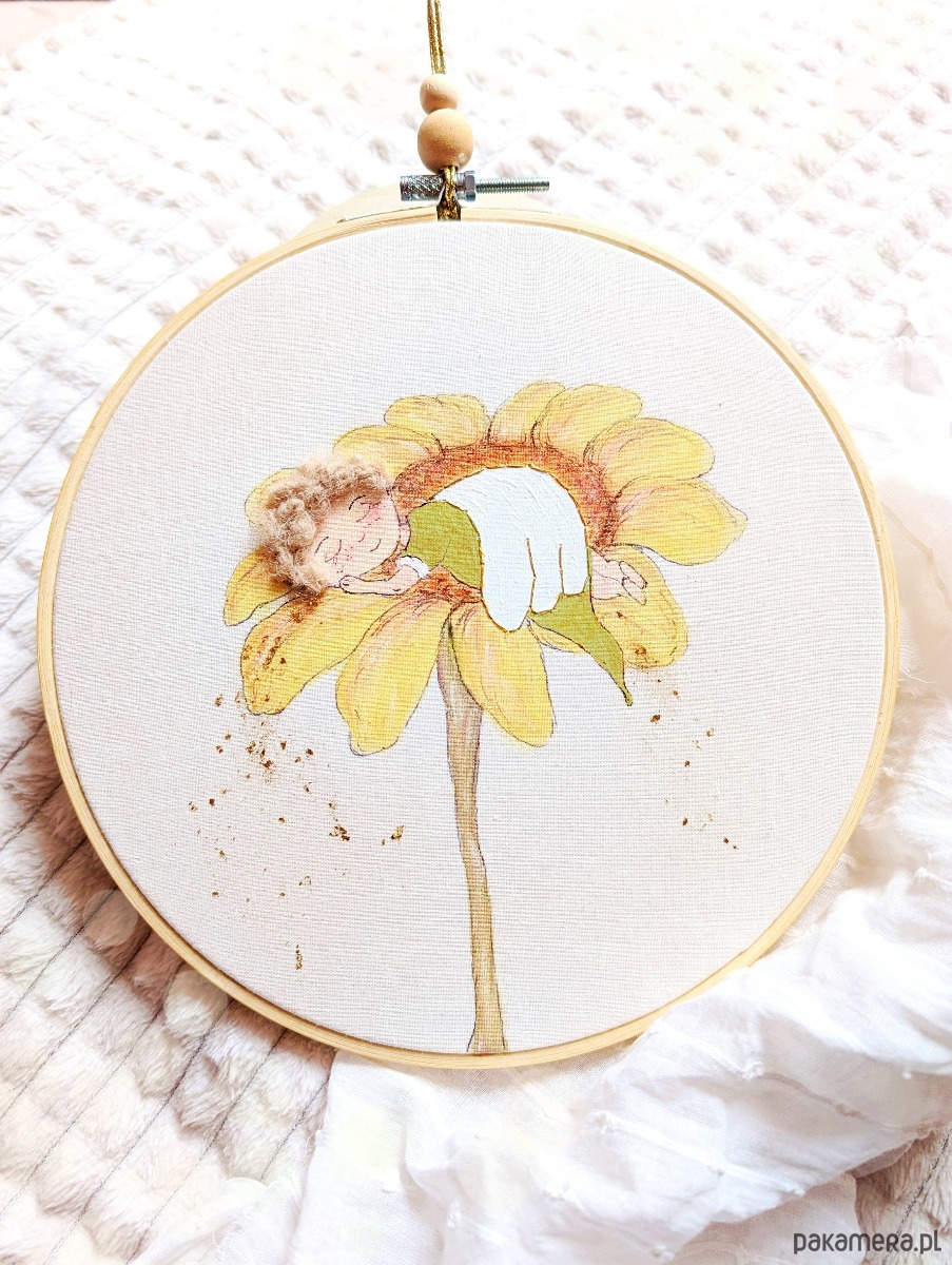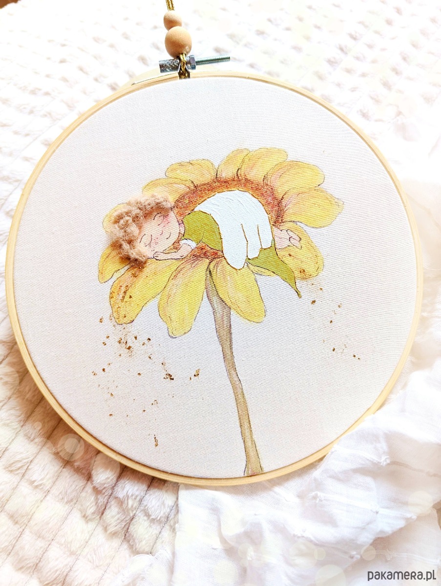 Obrazek oprawiony jest w bambusowy tamborek o średnicy 20 cm.