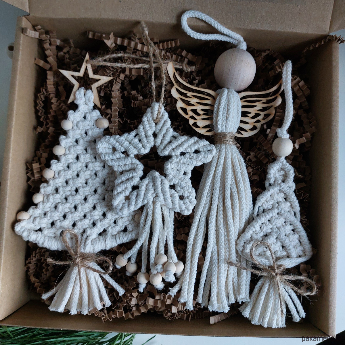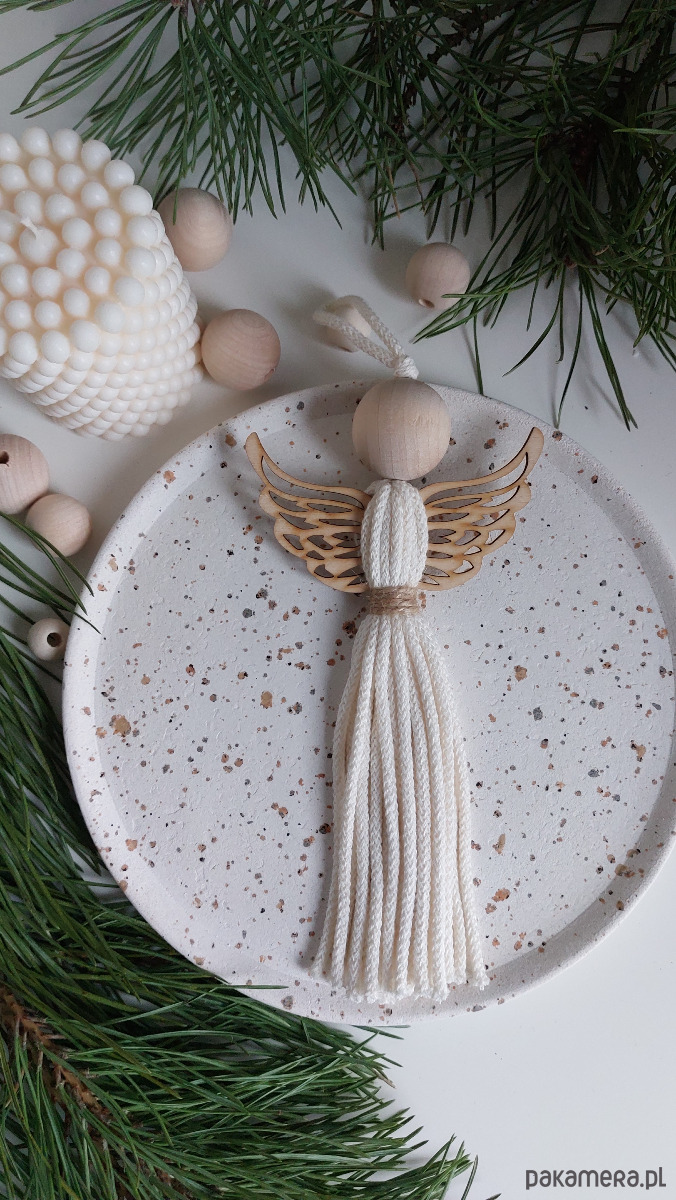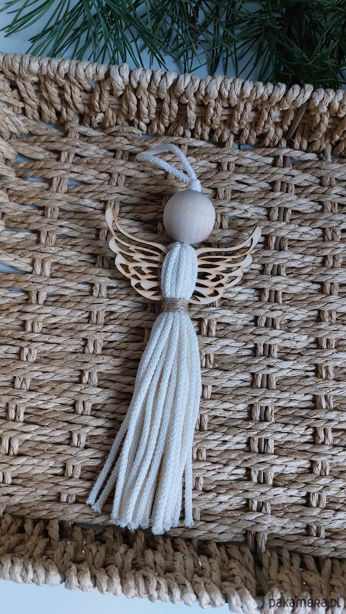 Ozdoba choinkowa Aniołek wykonana własnoręcznie ze sznurka bawełnianego 3mm w kolorze naturalnym z drewnianymi elementami (skrzydełka i główka)