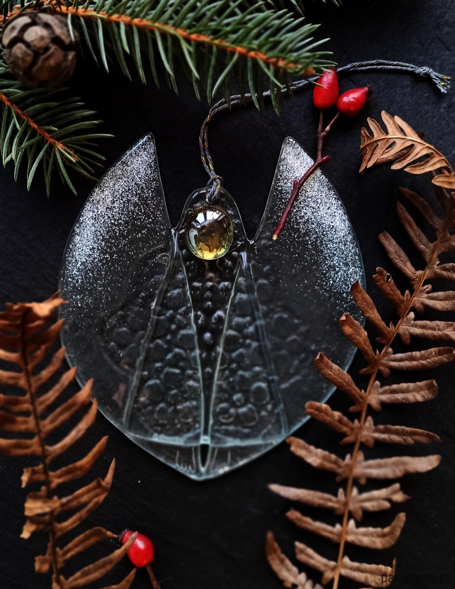 Aniołek wykonany z bezbarwnego szkła w technice fusingu. Na powierzchni grawerowane detale, spodnia strona z dekoracyjną fakturą. Główka z miodowego kaboszonu. Zawieszony na bawełnianym sznureczku. Wymiary 11x13cm