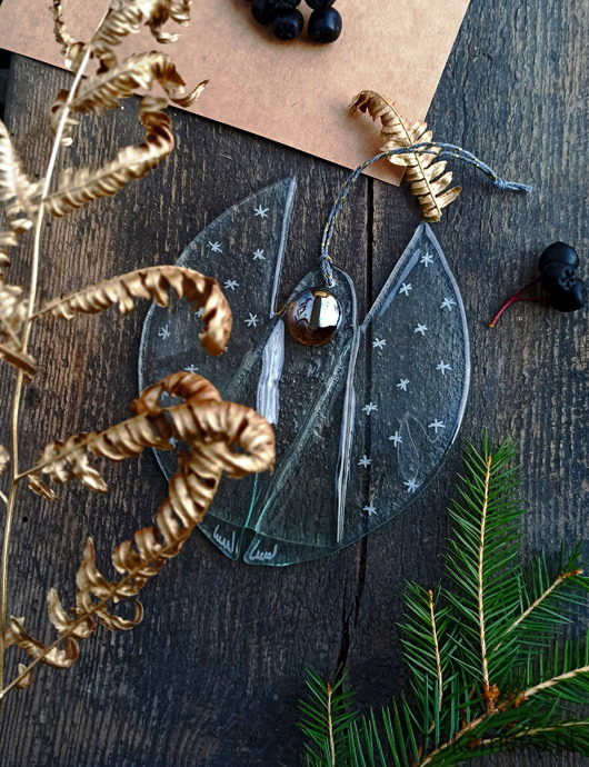 Aniołek wykonany z bezbarwnego szkła w technice fusingu. Na powierzchni grawerowane detale, spodnia strona z delikatną fakturą. Główka z miodowego kaboszonu. Zawieszony na bawełnianym sznureczku. Wymiary 11x13cm