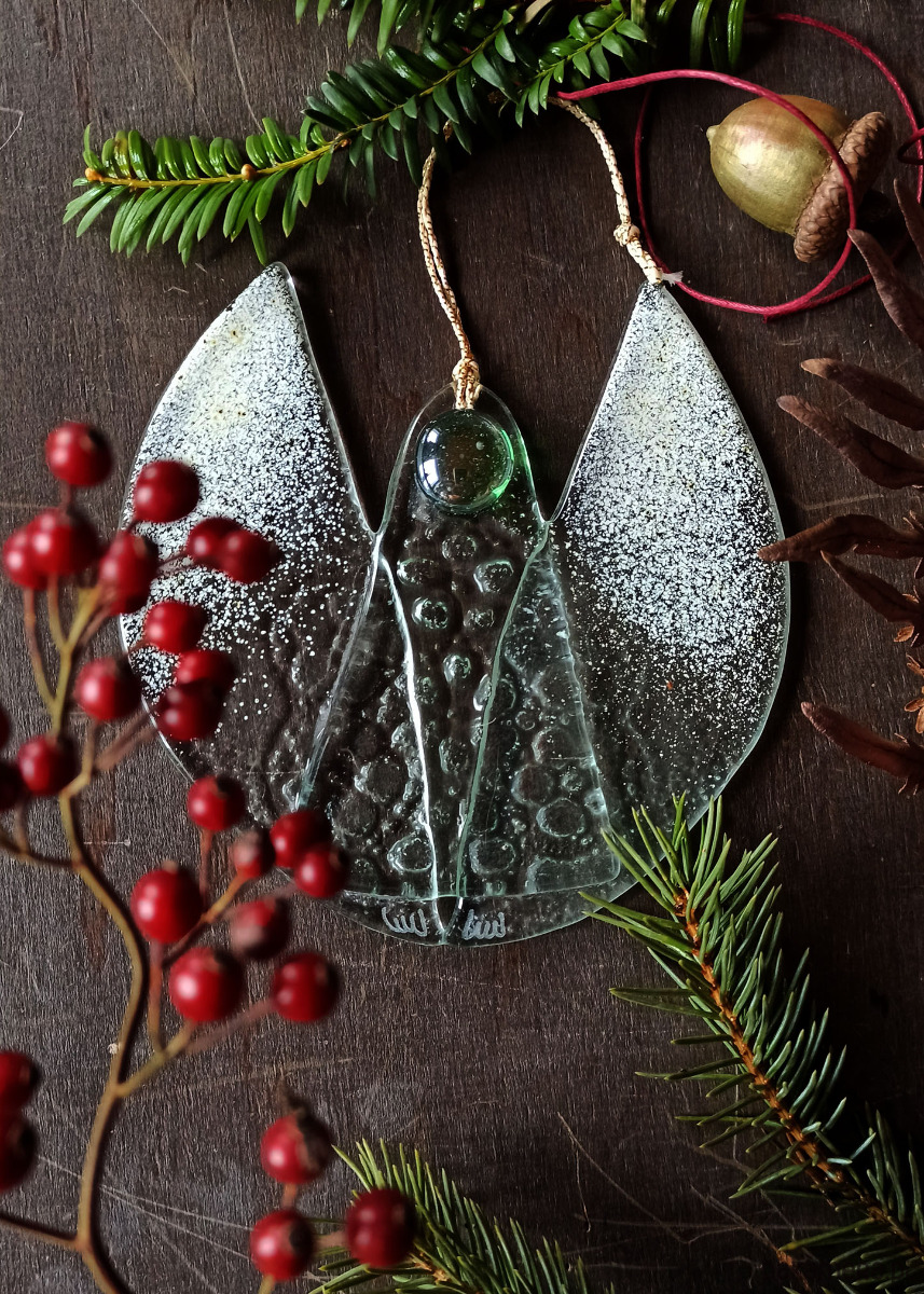 Aniołek wykonany ze szkła w technice fusingu. Na powierzchni grawerowane detale, spodnia strona z dekoracyjną fakturą. Główka z zielonego kaboszonu. Zawieszony na bawełnianym sznureczku. Wymiary 11x13cm
