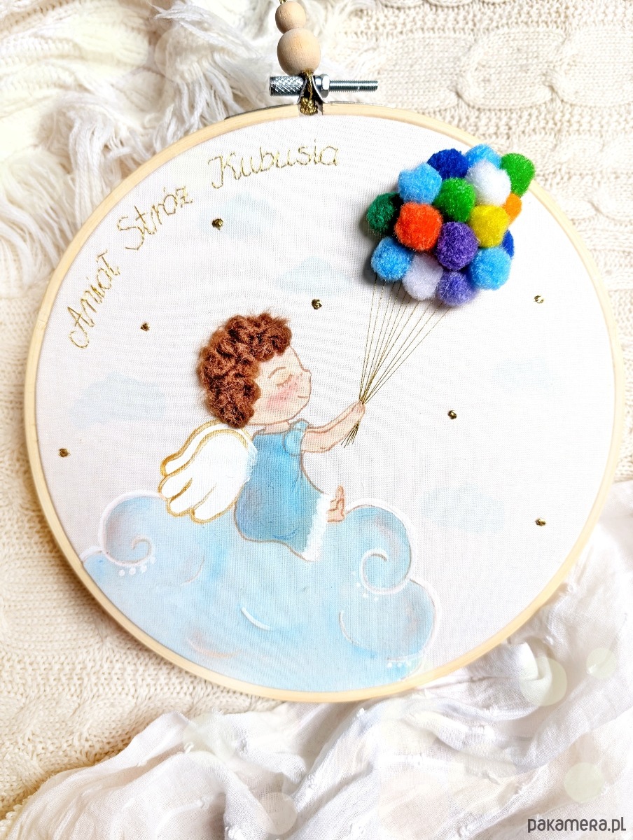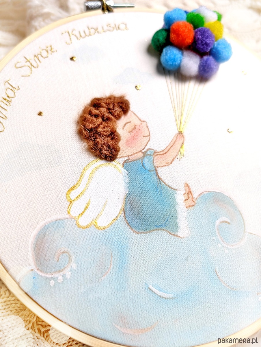 Efekt 3D tworzą włoski aniołka i baloniki.