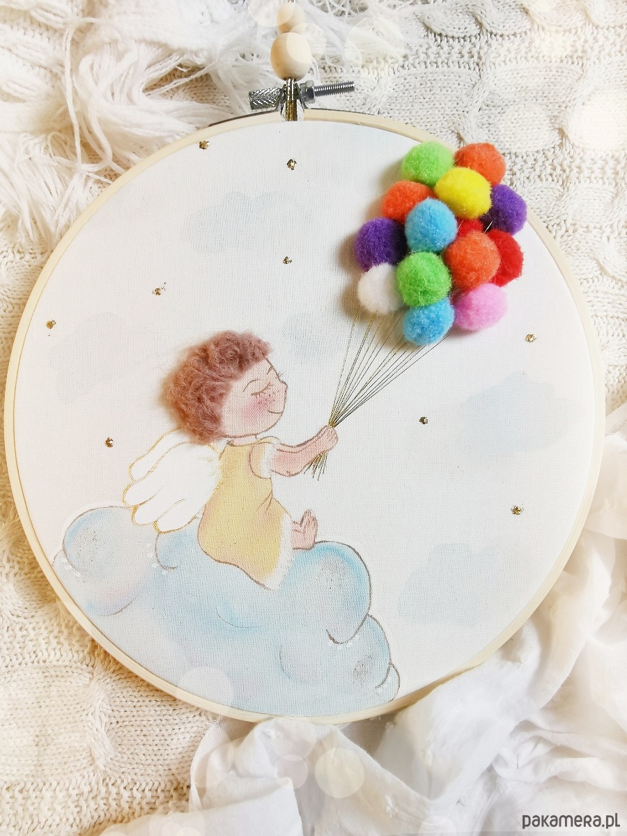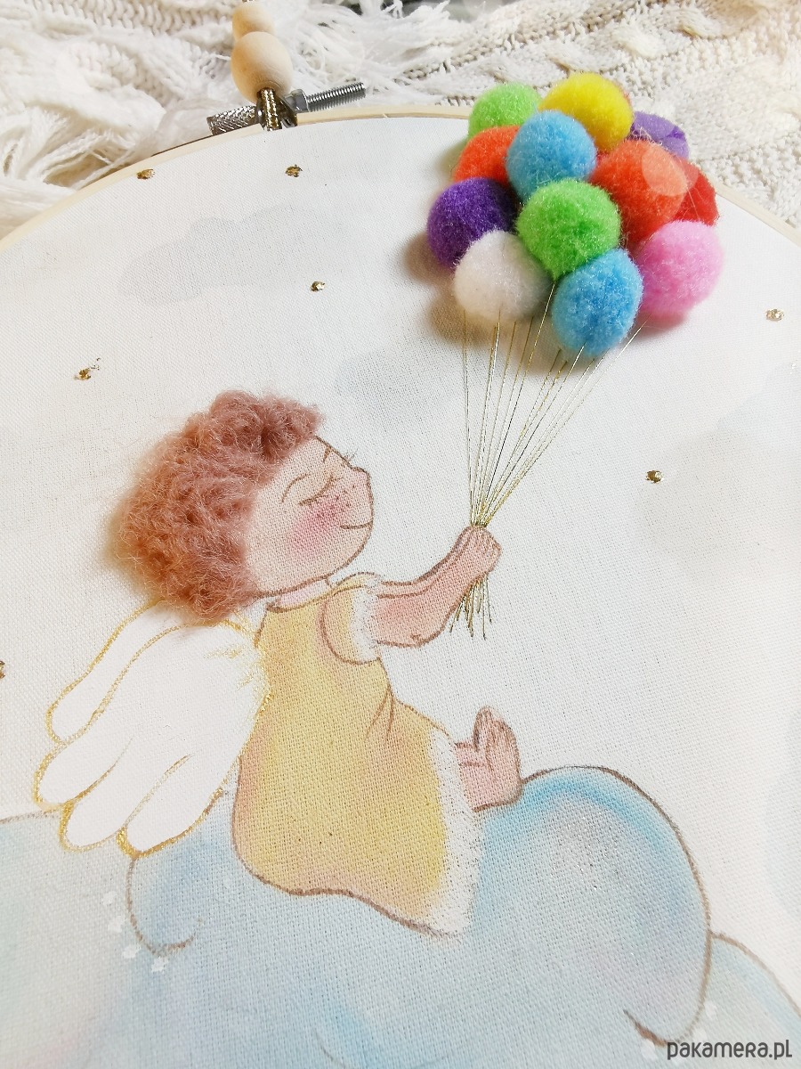Efekt 3D tworzą włoski aniołka i baloniki.