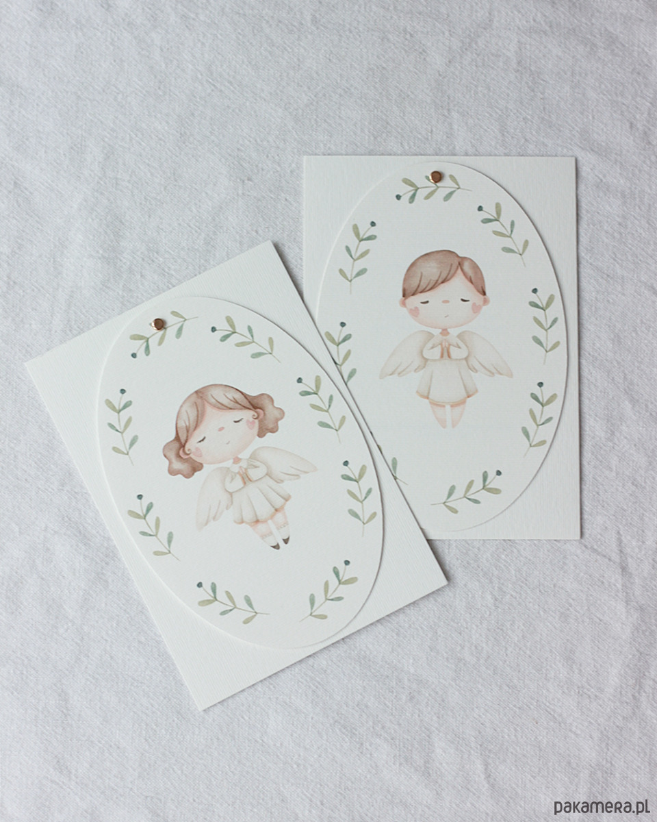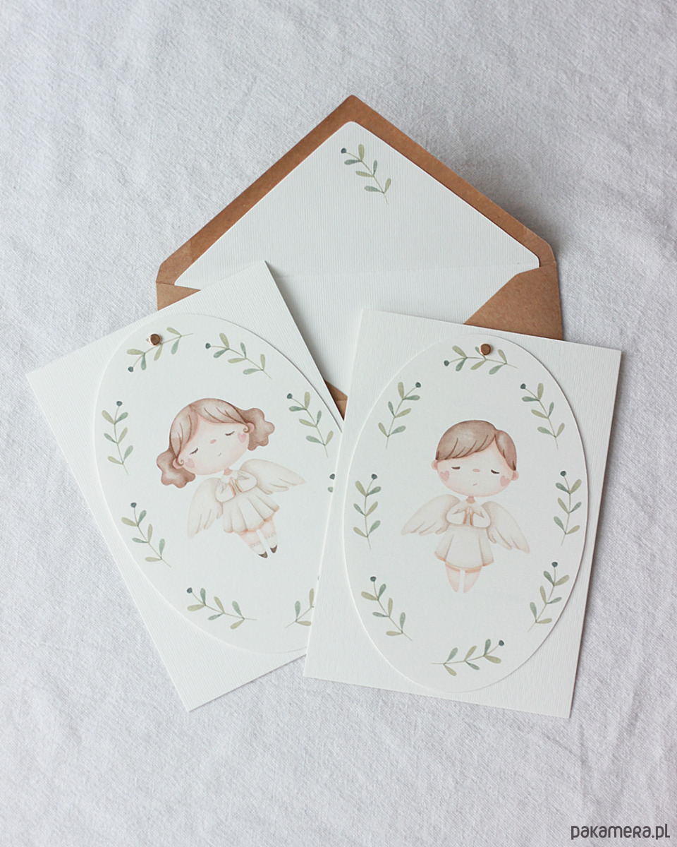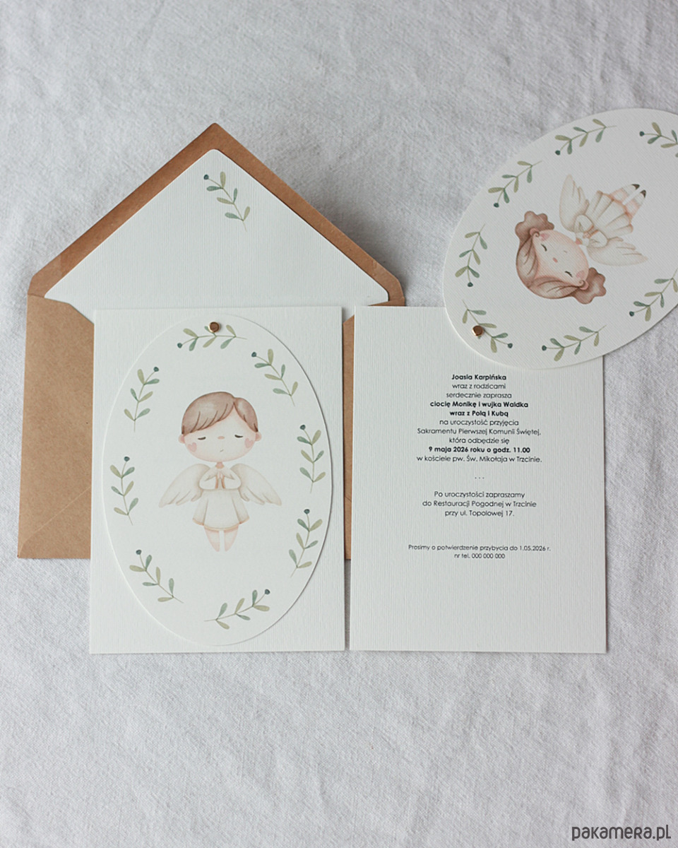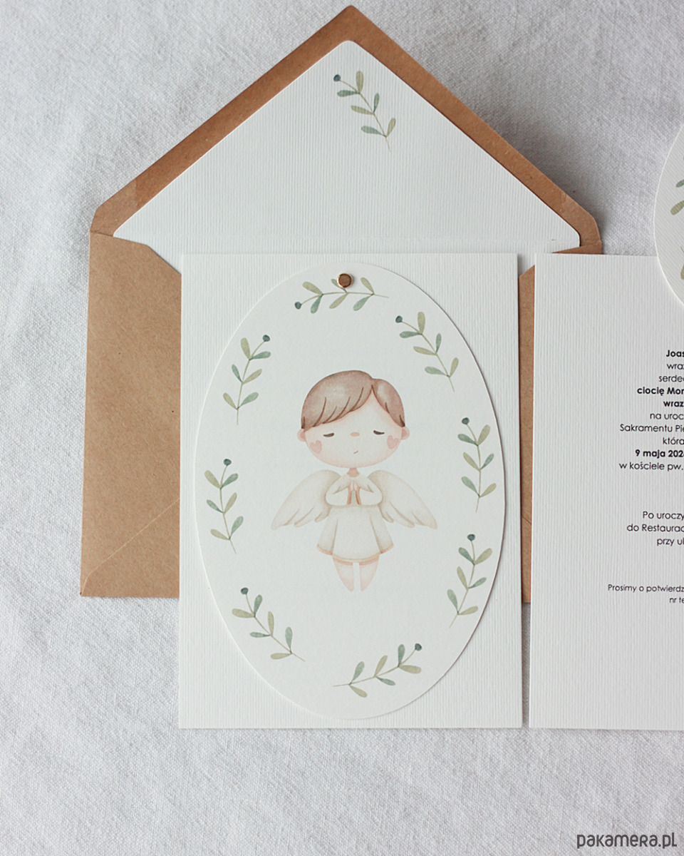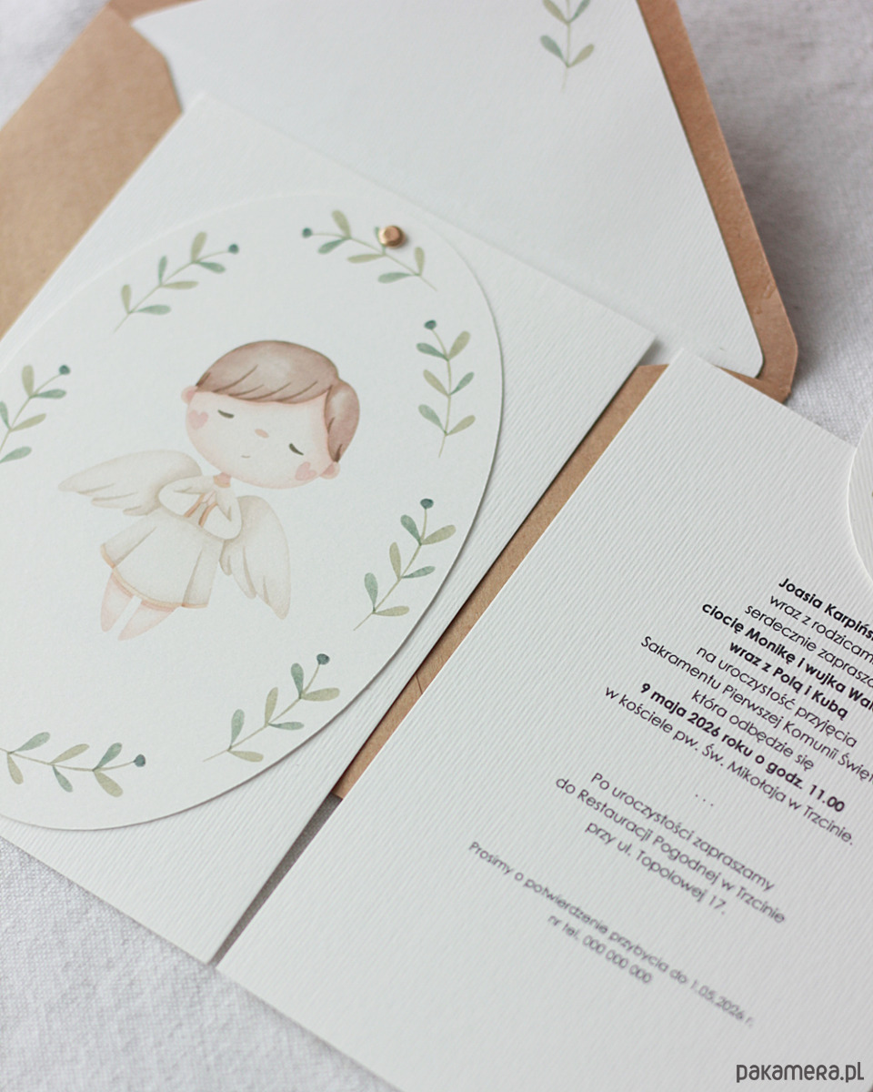 Delikatne zaproszenia komunijne z aniołkiem, dla chłopca.