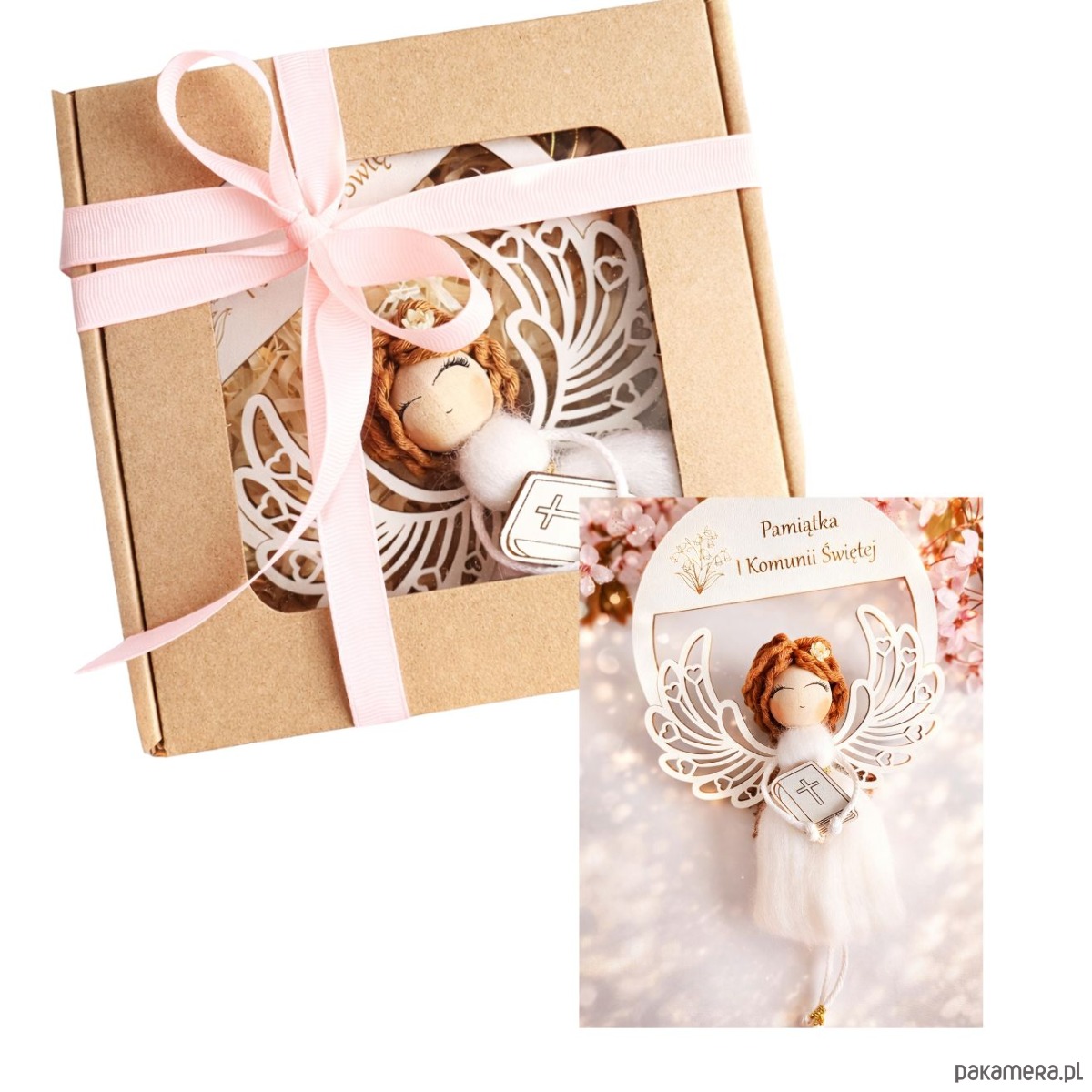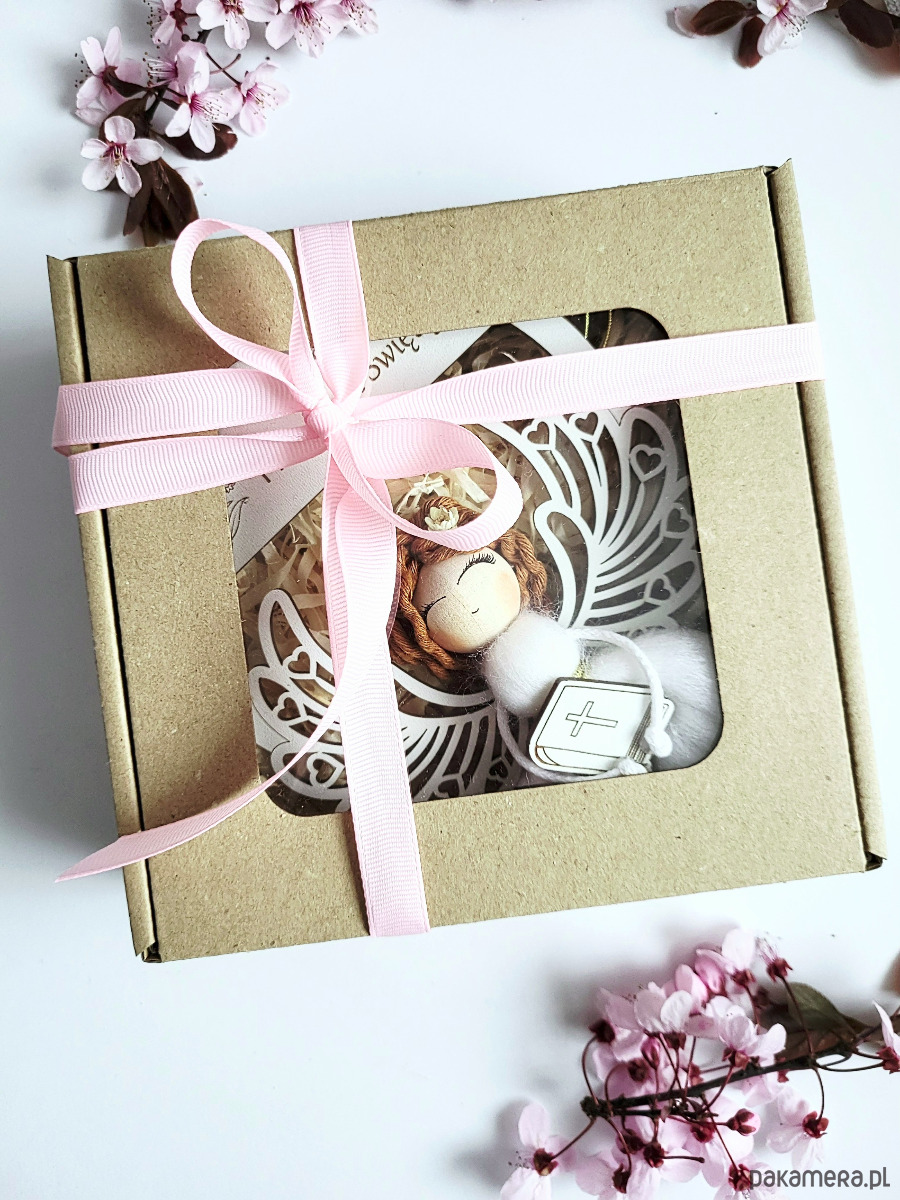 Aniołek jest gotowy do wręczenia mały prezent z zawiązanym różową kokardą (kolor wstążki mogę zmienić na czerwony lub ecru koronkowy)