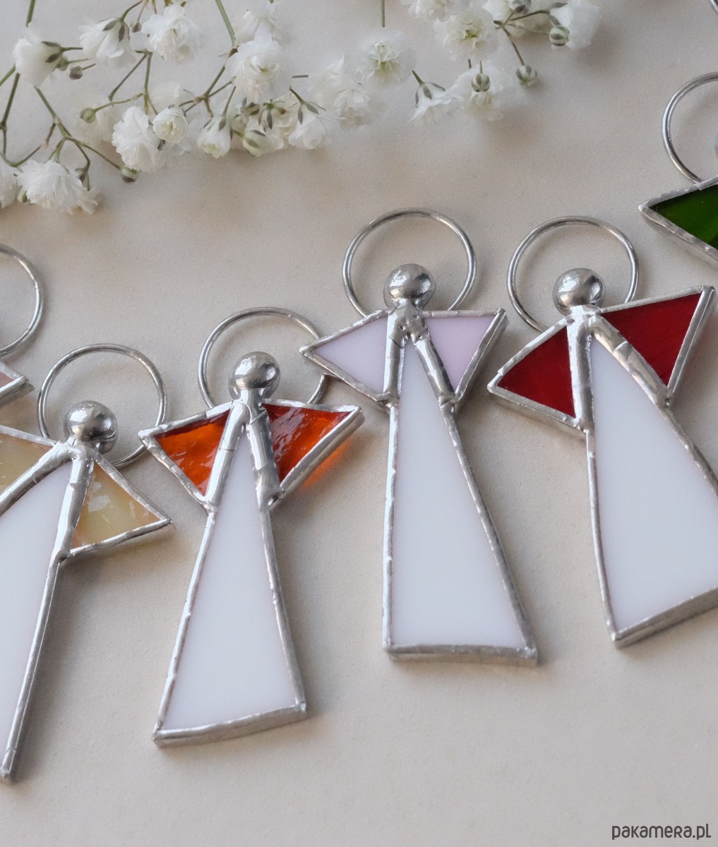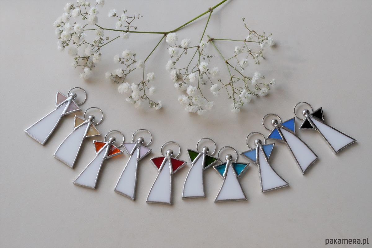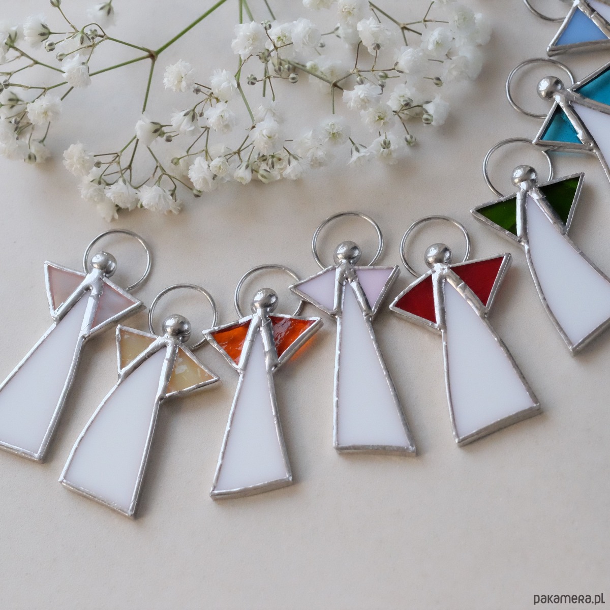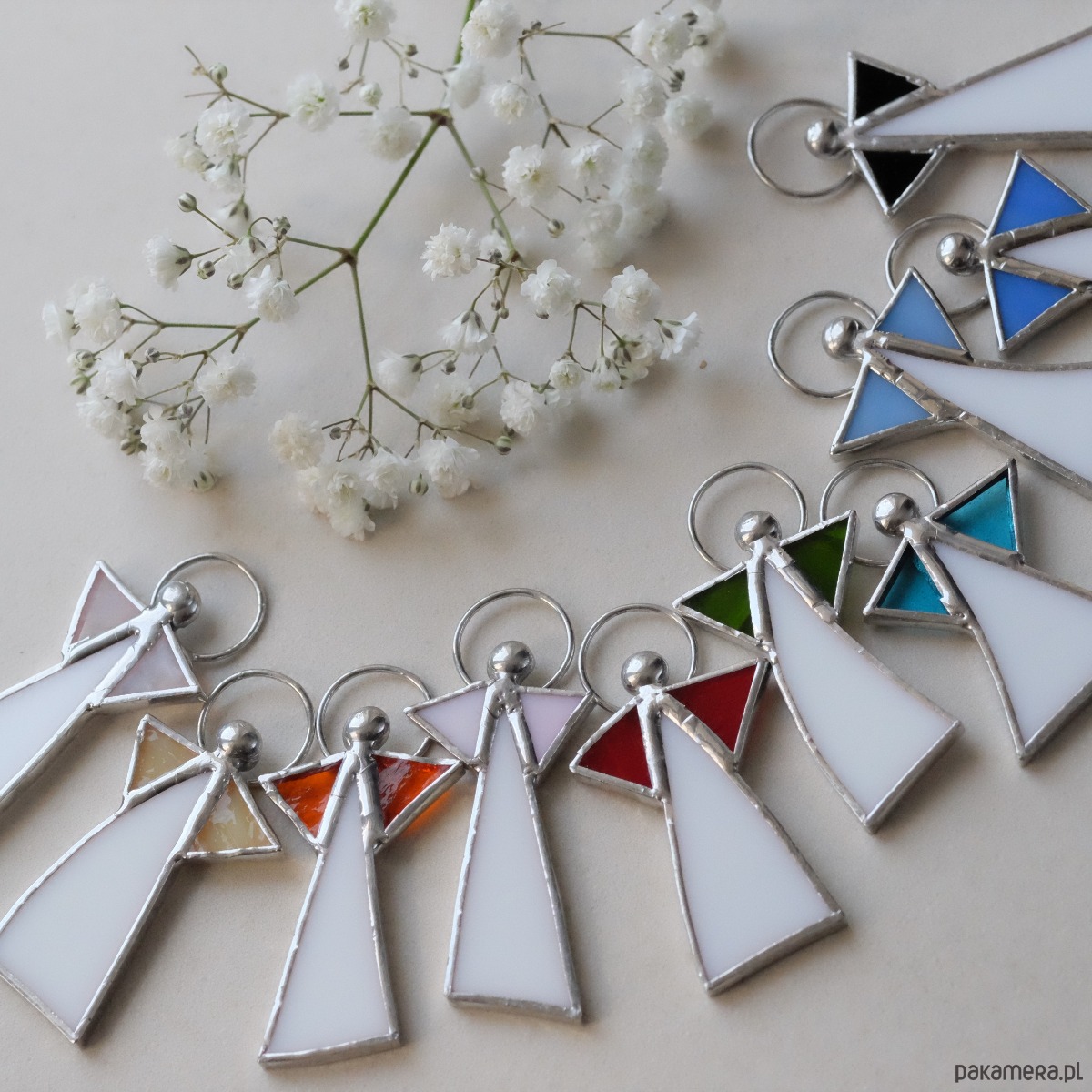Aniołki zostały wykonane z ręcznie wycinanego szkła witrażowego, skrzydełka w różnych kolorach, wykończone cyną w srebrnym kolorze. Aniołki są w całości ręcznie robione z najwyższą starannością i dbałością o szczegóły.