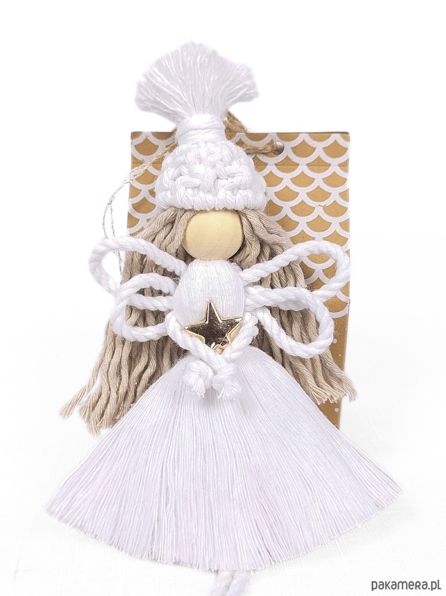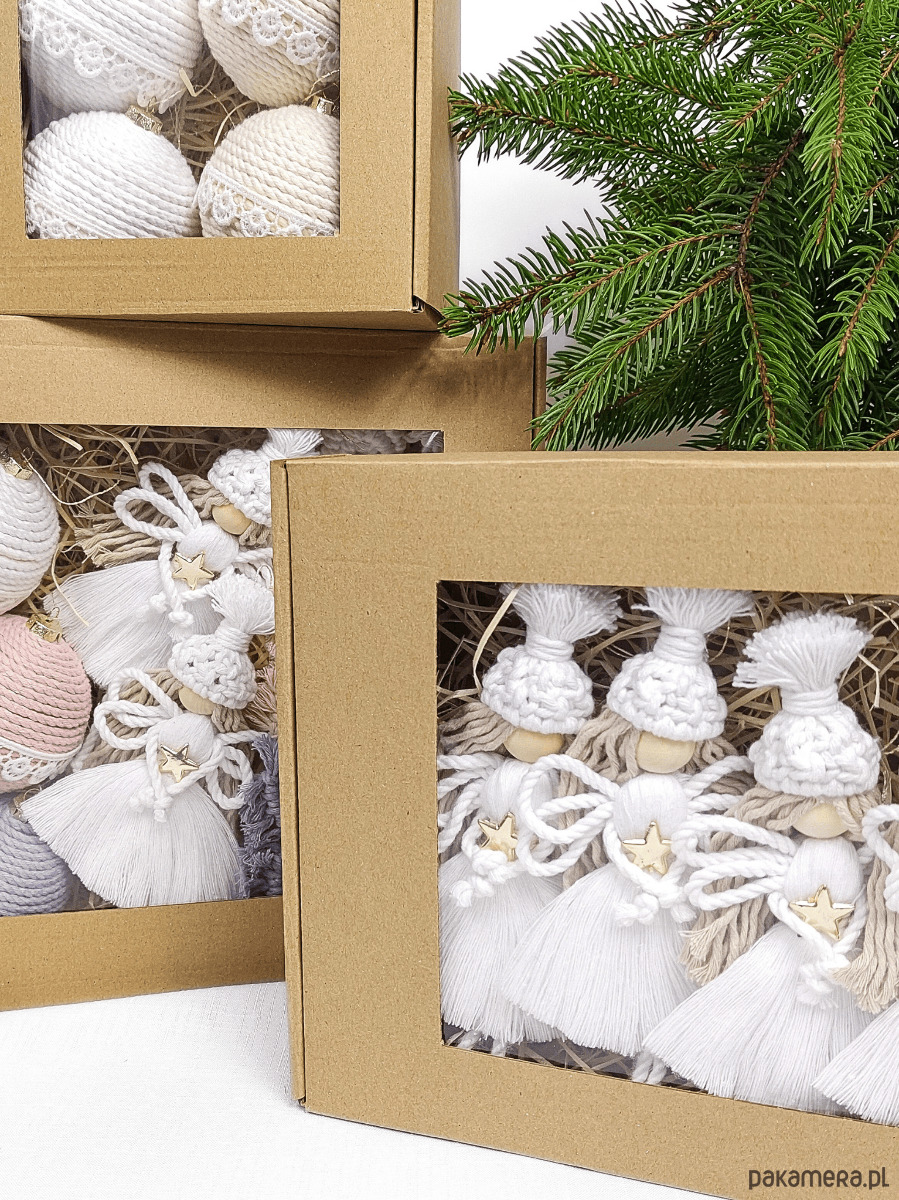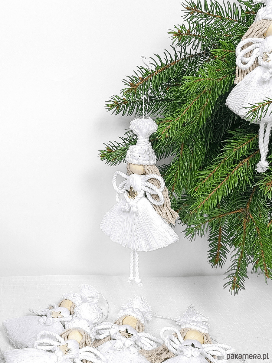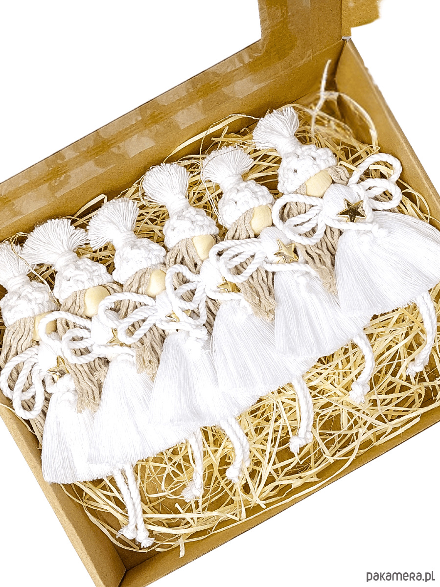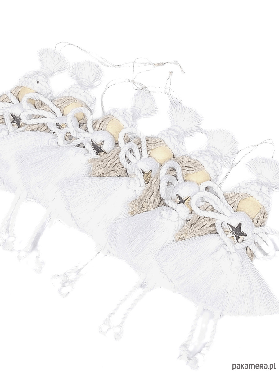 Zapraszam do zakupu uroczych, ręcznie wykonanych aniołków z białego bawełnianego sznurka, które stanowią niezwykłą ozdobę na Twoją choinkę. Zestaw zawiera 6 sztuk tych uroczych, makramowych aniołków, które dodadzą wyjątkowego uroku Twojemu świątecznemu drzewku.