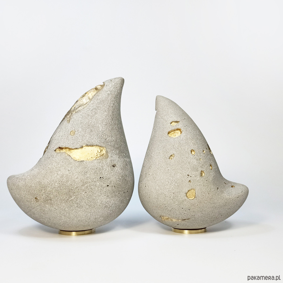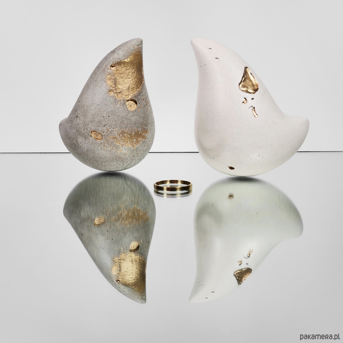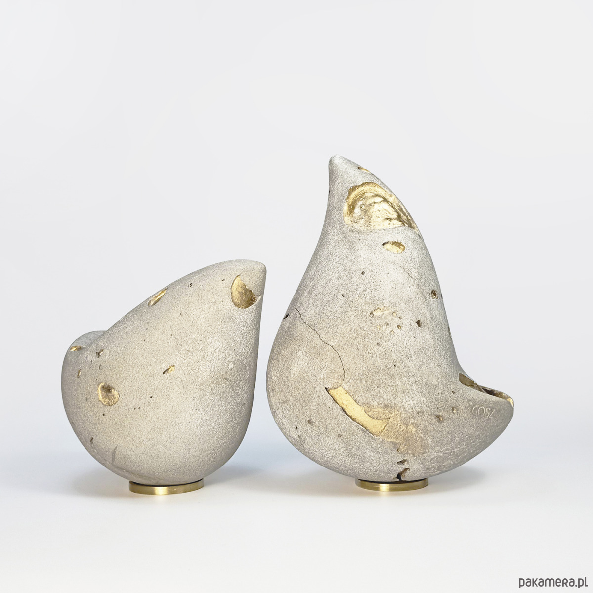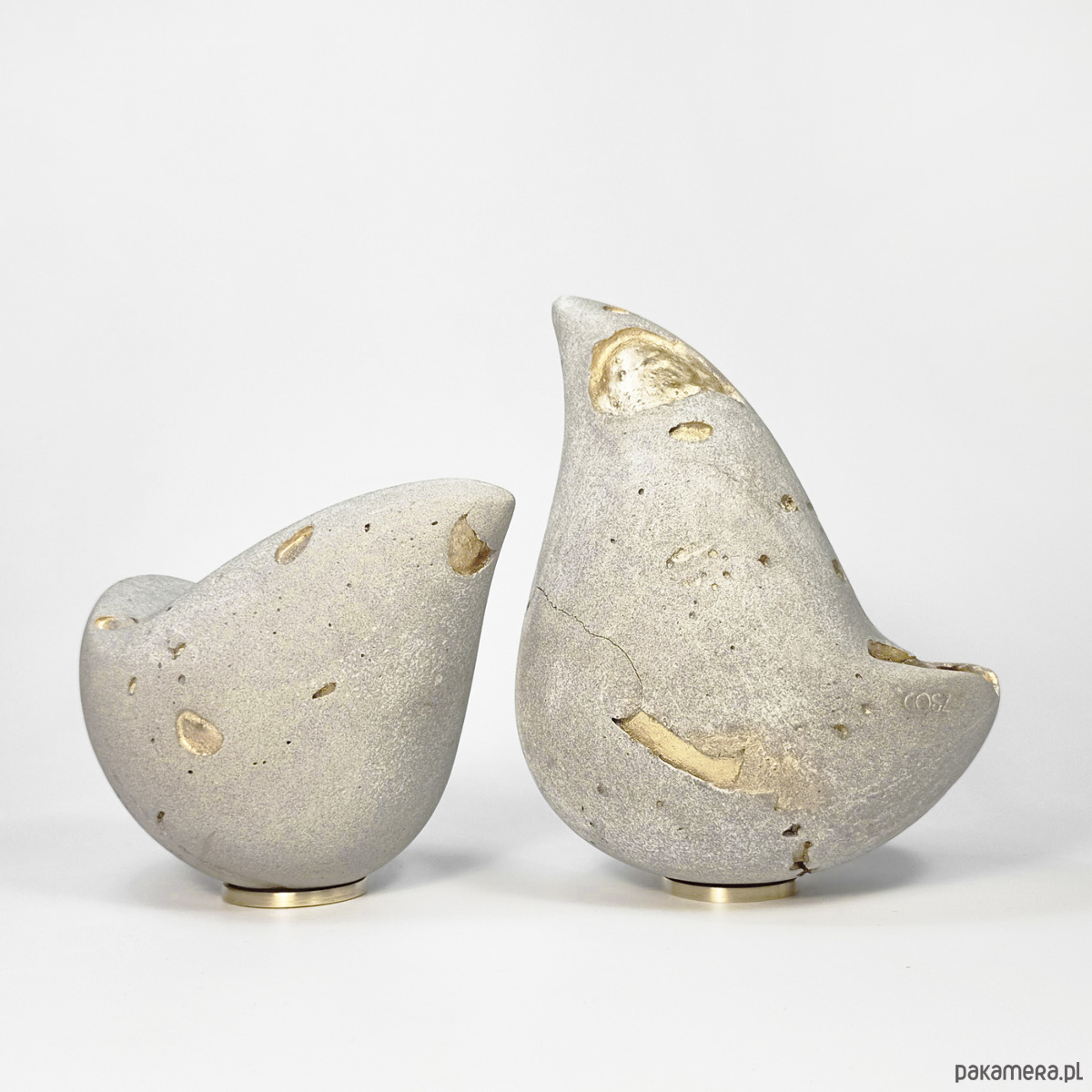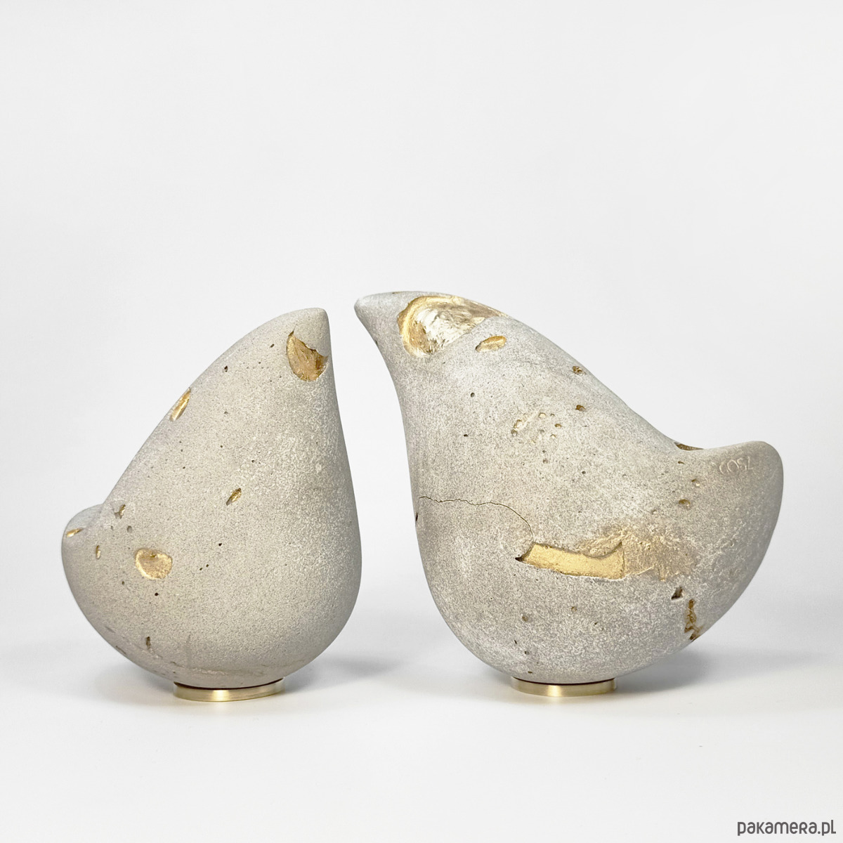 Gołąbki w całości wykonane są z cementu oraz różnej gęstości kruszywa. Szary powstały z mieszanki białego i szarego cementu, jego faktura jest porowata, z przebarwieniami charakterystycznymi dla naturalnego betonu. Powstaje w ten sposób za każdym razem produkt o nieco innym charakterze. Naturalne ubytki i pęknięcia wypełnione zostały złotą farbą nadając elegancki charakter rzeźby. Dzięki wykorzystaniu kruszywa o różnej gęstości gołąbek mimo przechylenia go na bok sam wróci do pozycji pionowej. Miła w dotyku forma o gładkiej powierzchni zachęca do wzięcia w dłoń i zabawy. Gołąbek może kręcić się wokół własnej osi, kiwać na boki lub pochylać się do przodu i do tyłu. Gdy chcemy nadać rzeźbie nieco inny charakter możemy postawić ją na mosiężnej obrączce zatrzymując jej ruch. Nasz gołąbek może ustawić się podnosząc dzióbek do góry, spoglądać na Nas z boku lub sprawdzać co leży u jego boku.