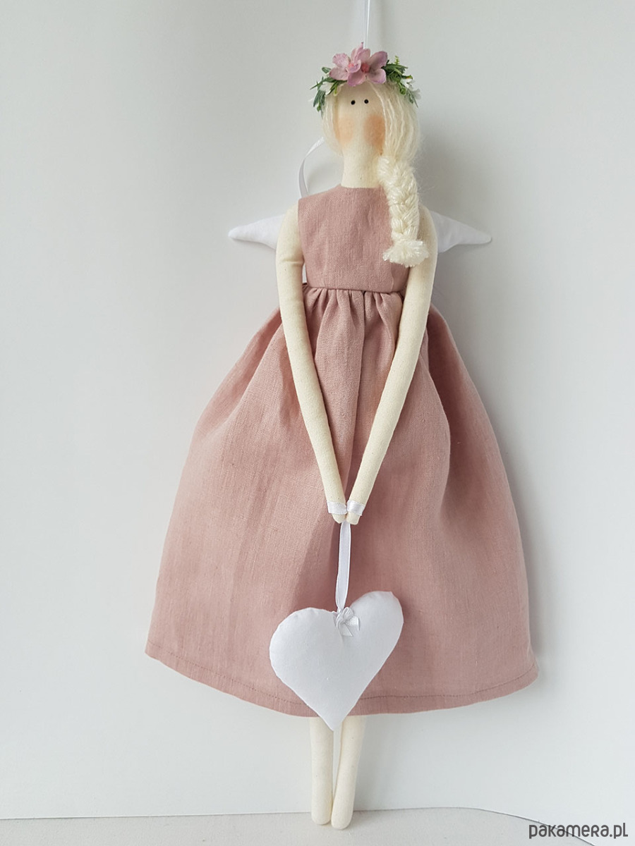 Lalka - anioł , ubrana w lnianą sukienkę w kolorze różowym. Ma białe skrzydełka ,serce oraz wianek. Lalka może siedzieć - wysokość 50 cm. Lalka uszyta z tkanin bawełnianych , wypełniona antyalergicznym włóknem silikonowym. Technika wykonania - szycie ręczne i na maszynie.