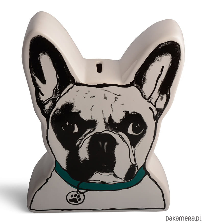 Skarbonka ceramiczna w kształcie buldożka francuskiego.