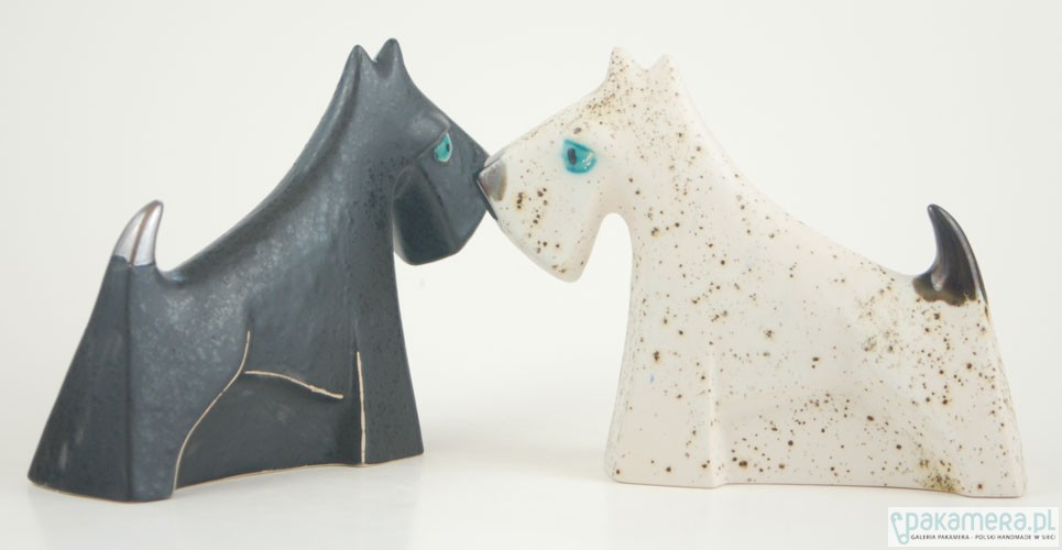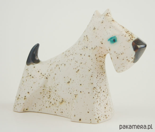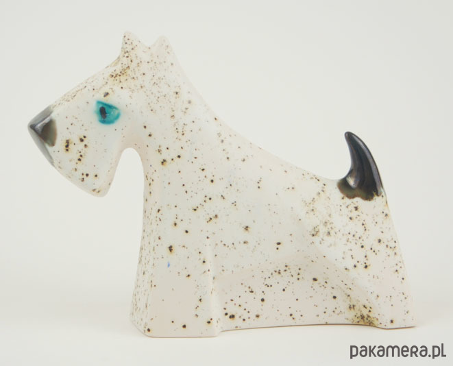 Ceramiczna miniatura rzeźbiarska, ręcznie malowana szkliwami efektowymi. Piesek wysoki na 14cm. Chętnie przechowa na swojej szyi bransoletę a na ogonie cenny pierścionek. Z wielkim oddaniem pilnuje wszystkich powierzonych mu kosztowności.