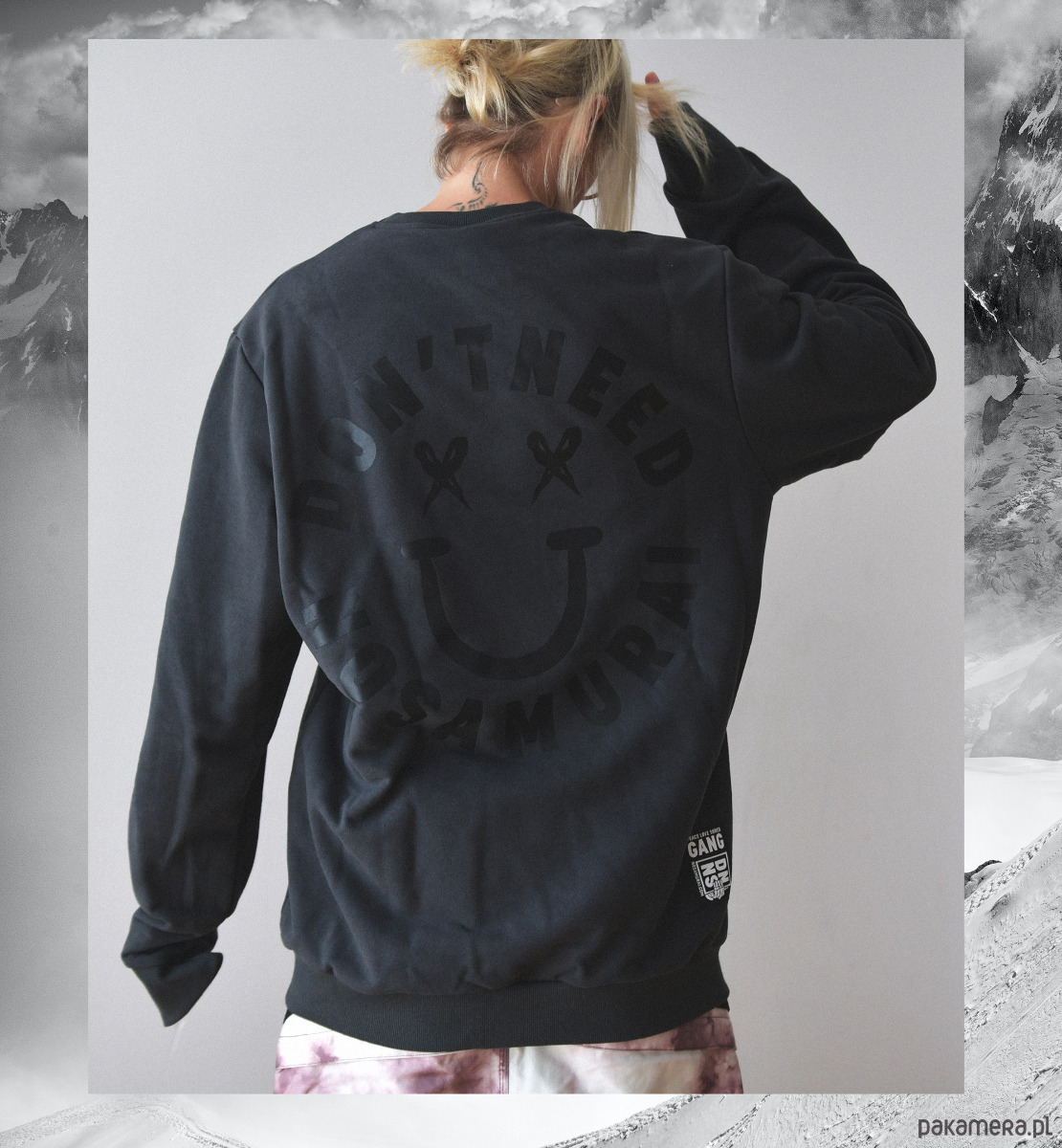 Na bogato grafika z tyłu i subtelnie z przodu. Sitodruk. Wewnętrzna część z wszytym czarnym potnikiem DON’T NEED NO SAMURAI.
