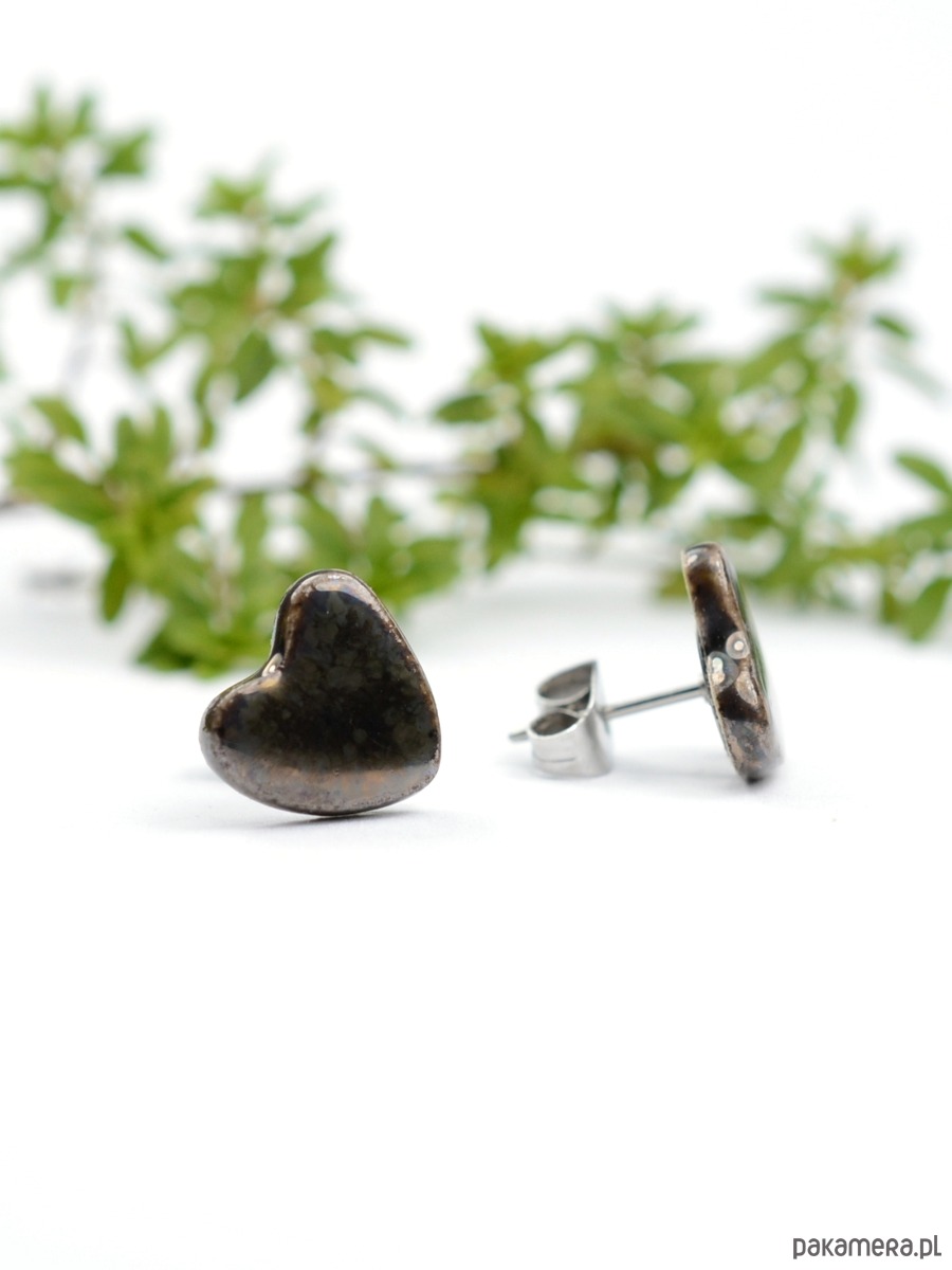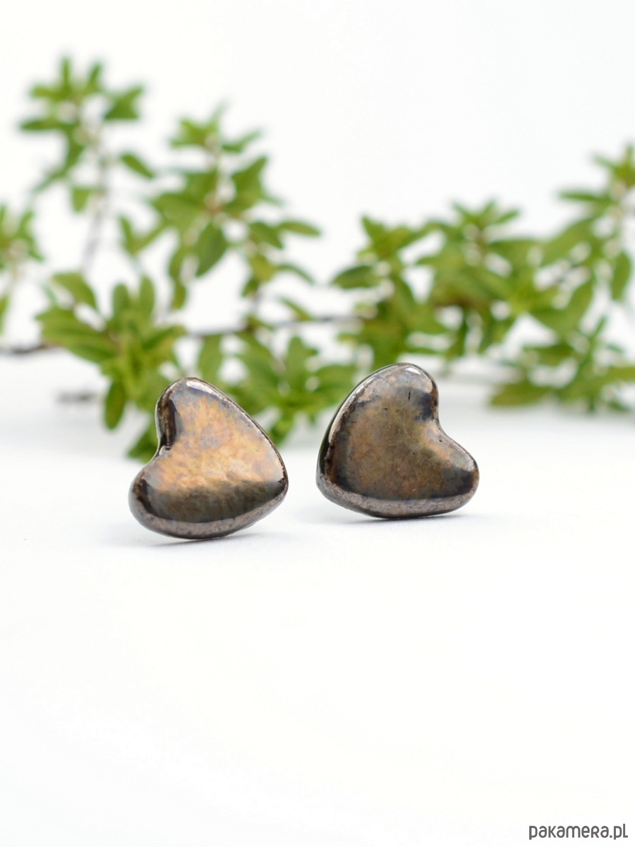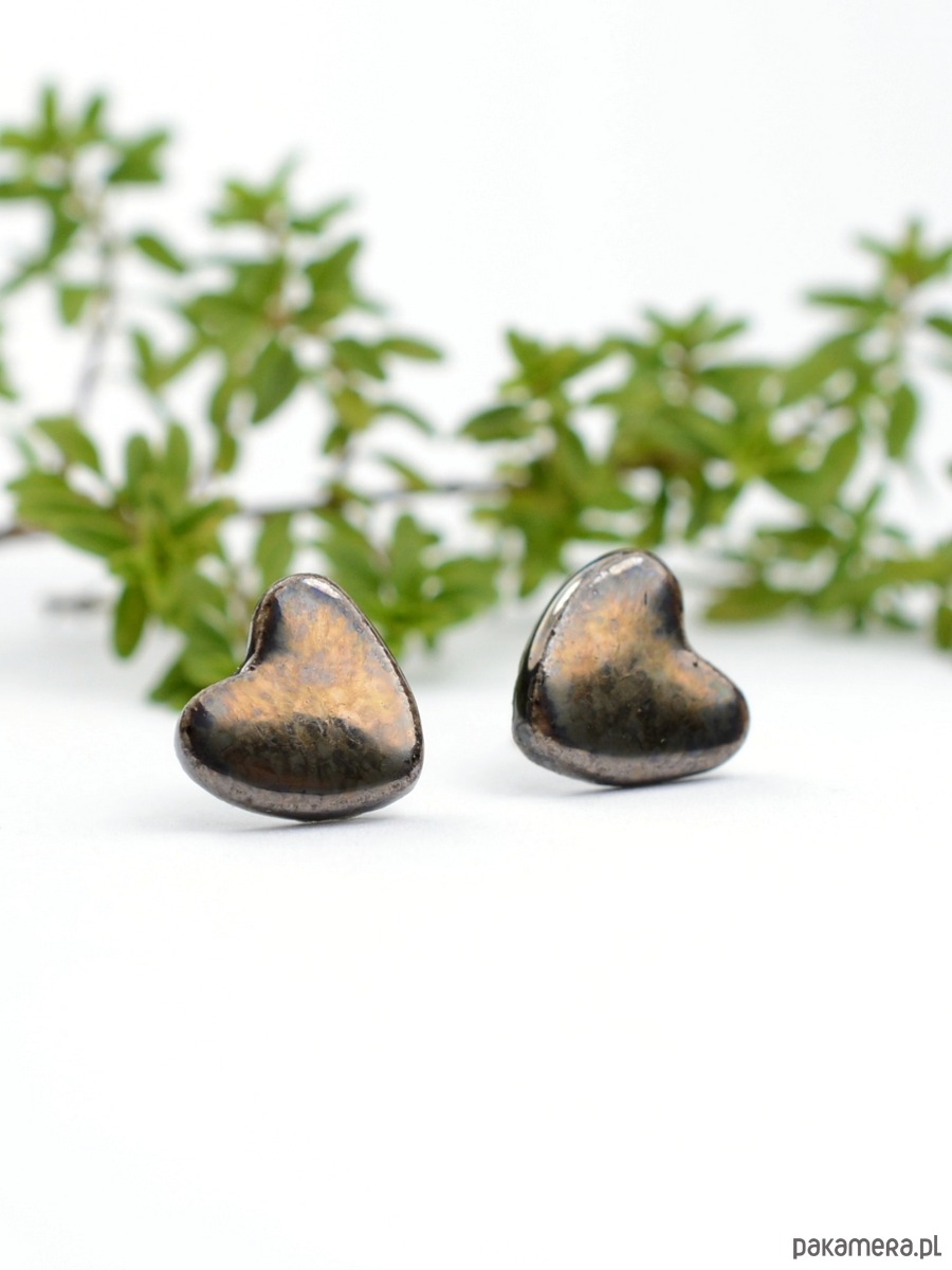 Kolczyki w kształcie serduszek o średnicy 1cm i grubości 2mm .Elementy zostały poszkliwione szkliwem w kolorze dymnego brązu z efektem złotawego połysku. Szkliwo wygląda różnie w zależności od oświetlenia-obrazują to zdjęcia. Elementy ceramiczne zostały przeze mnie dopracowane w najmniejszym szczególe :))) Kolczyki są solidnie umocowane na sztyftach ze stali chirurgicznej- antyalergiczna, w kolorze oksydowanego srebra. Wysyłam ozdobnie zapakowane- gotowe na prezent:)