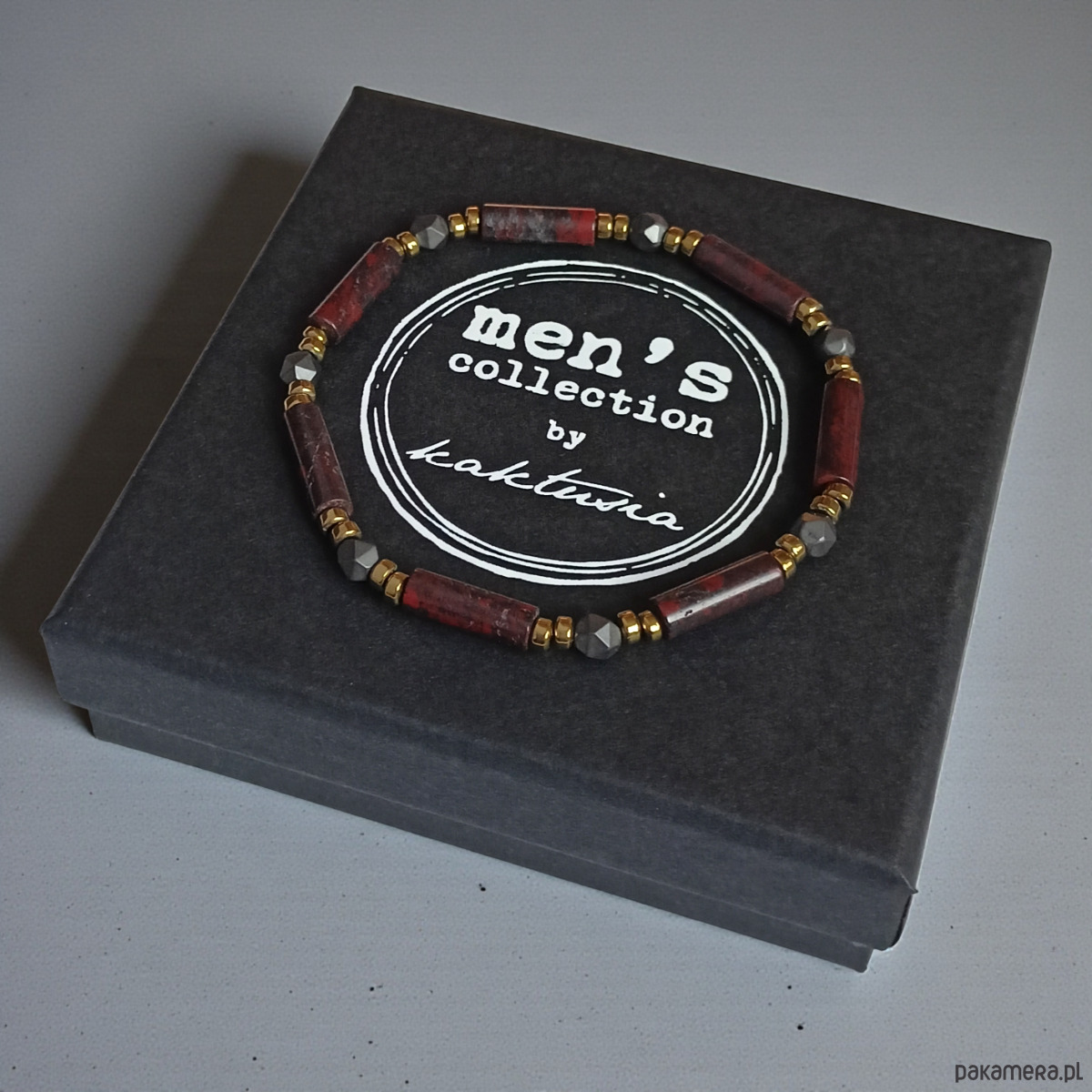 wykonana z jaspisu błysk (słupki 4x13mm), matowego hematytu, delikatnych przekładek z hematytu.