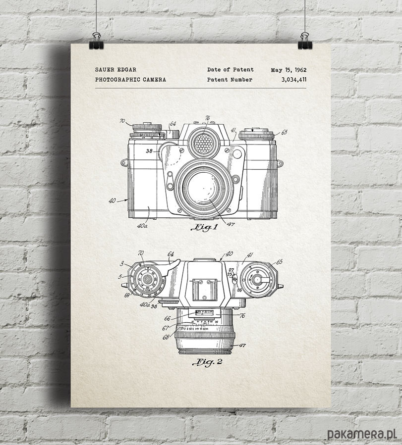 Plakat z reprodukcją patentu na aparat fotograficzny, autorstwa Edgara Sauera. Patent o numerze 3,034,411 został udzielony w 1962 roku przez Urząd Patentów i Znaków Towarowych Stanów Zjednoczonych.