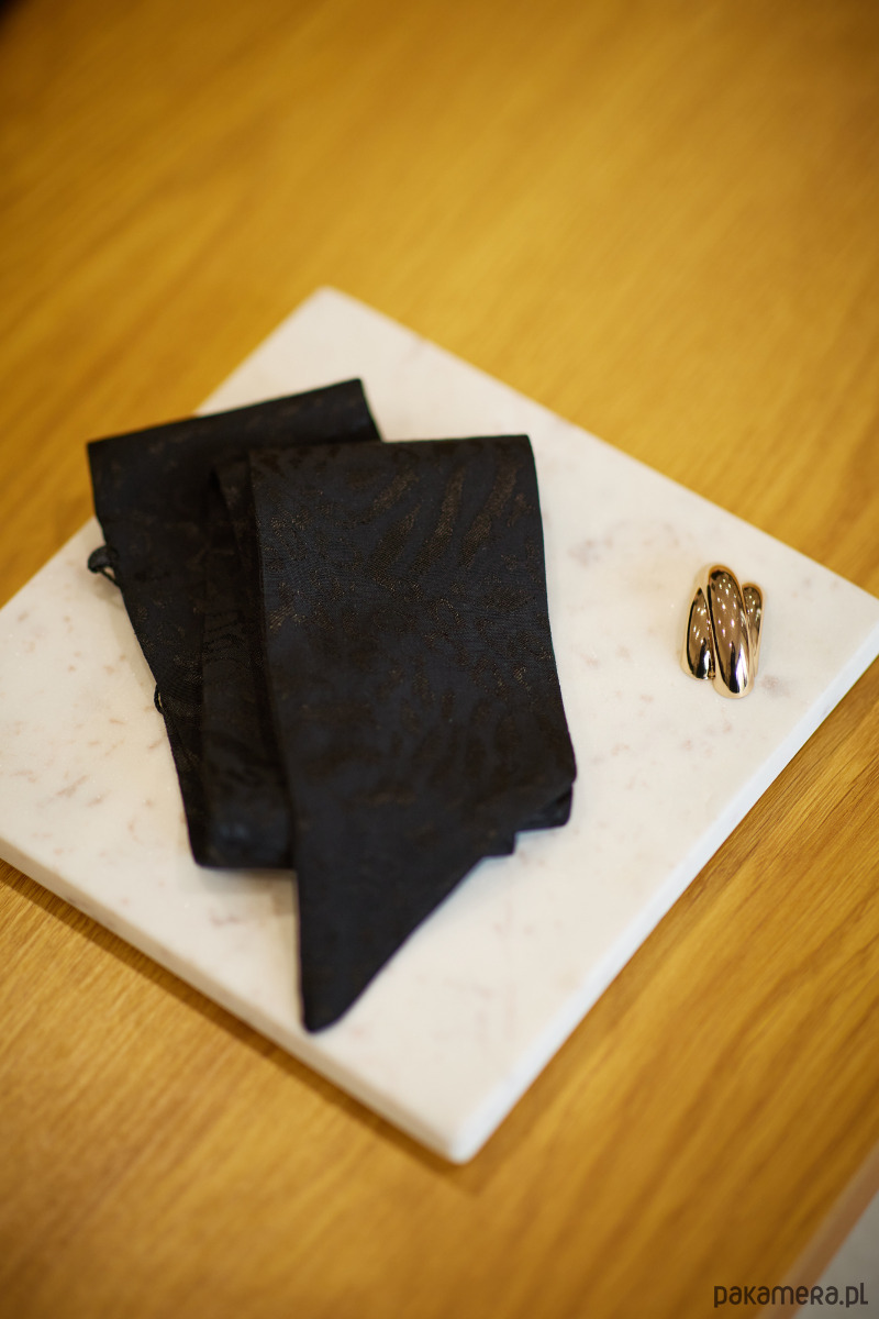 Wyjątkowa apaszka z eleganckim żakardem. W zestawie elegancka, złota klamerka.