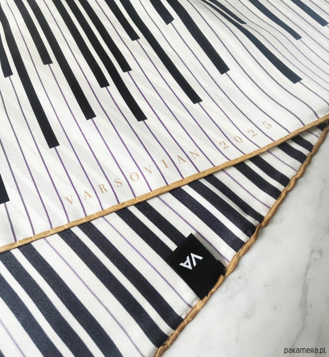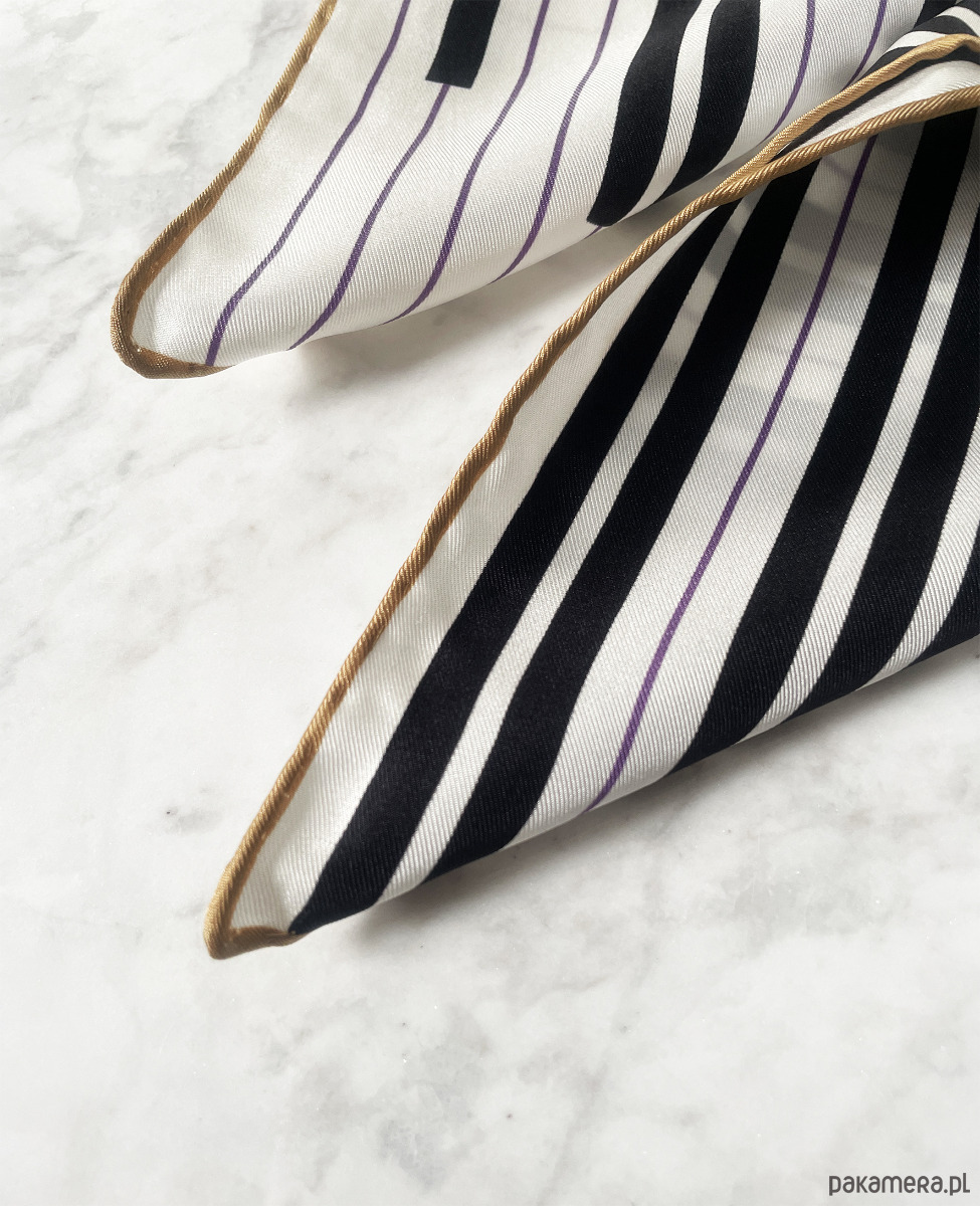 Apaszka „Chopin’s Piano” to hołd dla tego dziedzictwa – prosta, elegancka kompozycja bieli i czerni, z fiołkowym akcentem w tle, kolorem, który według przekazów szczególnie lubił kompozytor. Wykończona złotą ramką i ręcznie rolowana. We wzór wkomponowany jest piękny cytat C.K. Norwida o Chopinie: „Rodem Warszawianin, sercem Polak, a talentem świata Obywatel”.