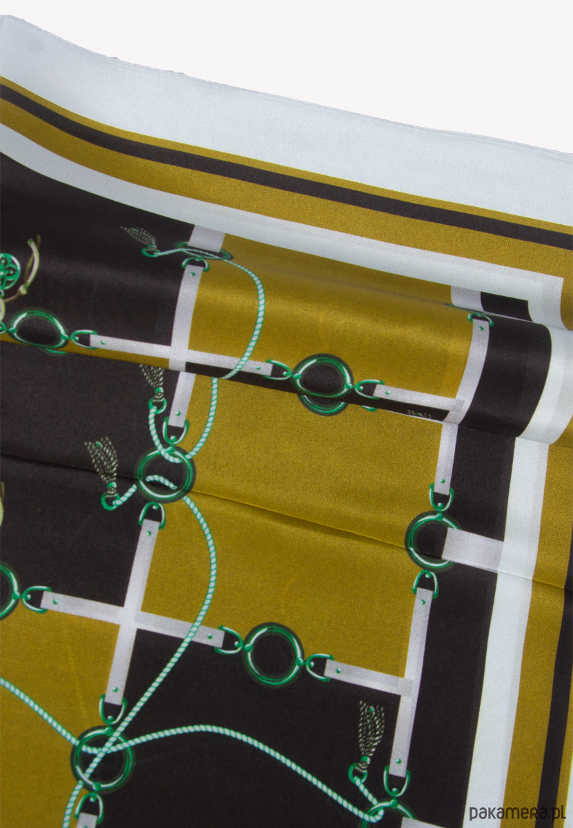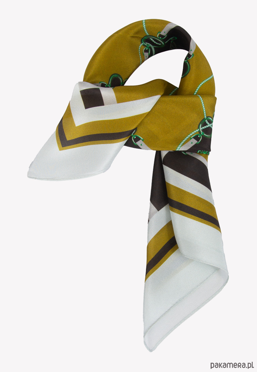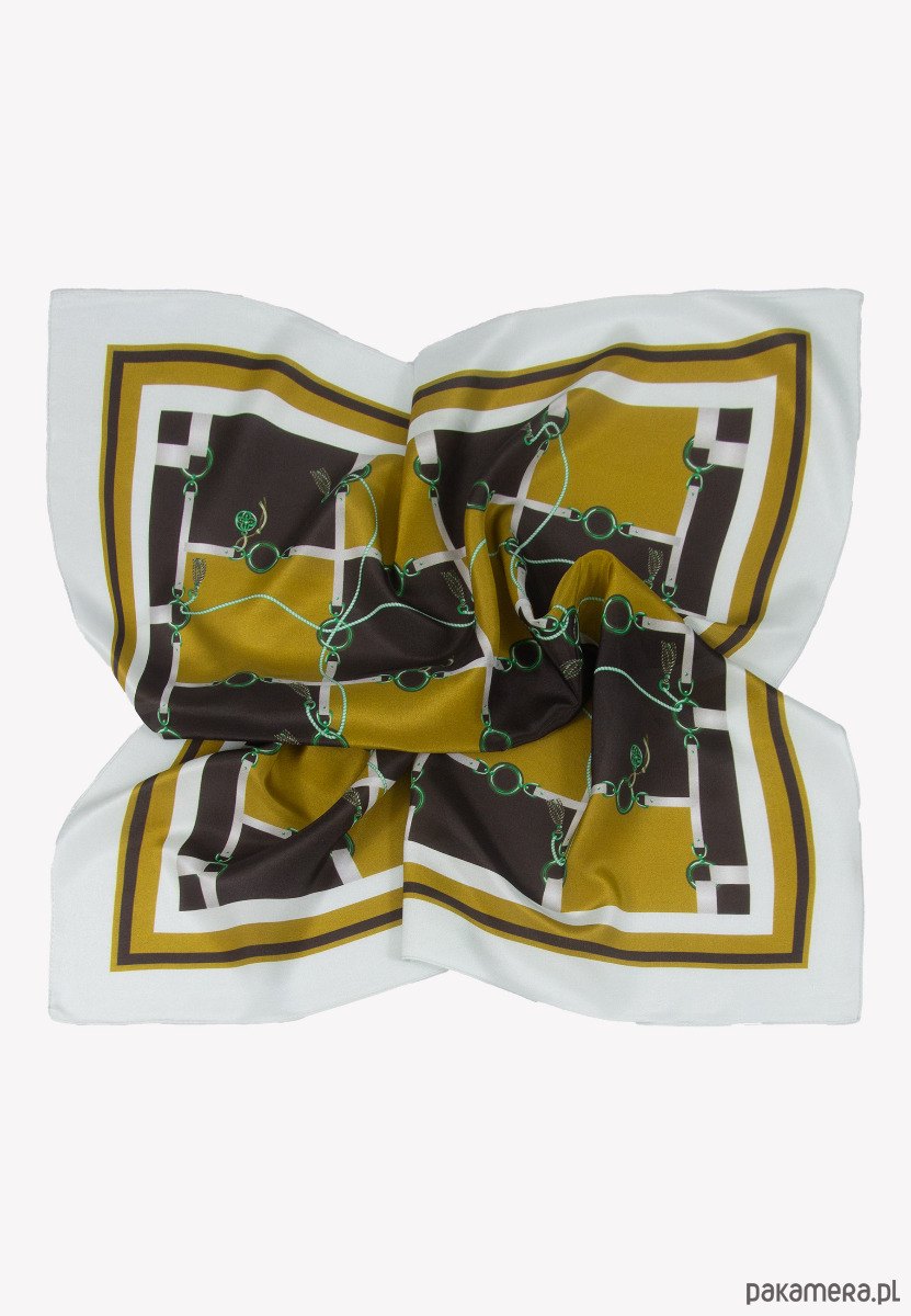 Ta elegancka gawroszka to połączenie klasyki z nowoczesnym akcentem, gdzie geometryczny układ i detale inspirowane jeździeckim stylem nadają jej wyrafinowany charakter. Harmonijna paleta musztardowej żółci, głębokiego brązu i świeżej bieli sprawia, że jest to dodatek zarówno do minimalistycznych, jak i bardziej wyrazistych stylizacji. Kontrastowe pasy oraz subtelne elementy w odcieniach zieleni dodają jej dynamicznego, ale nadal ponadczasowego wyglądu. To akcesorium idealne dla kobiet ceniących klasykę w nowoczesnym wydaniu – elegancja spotyka tu wyrafinowaną swobodę.
