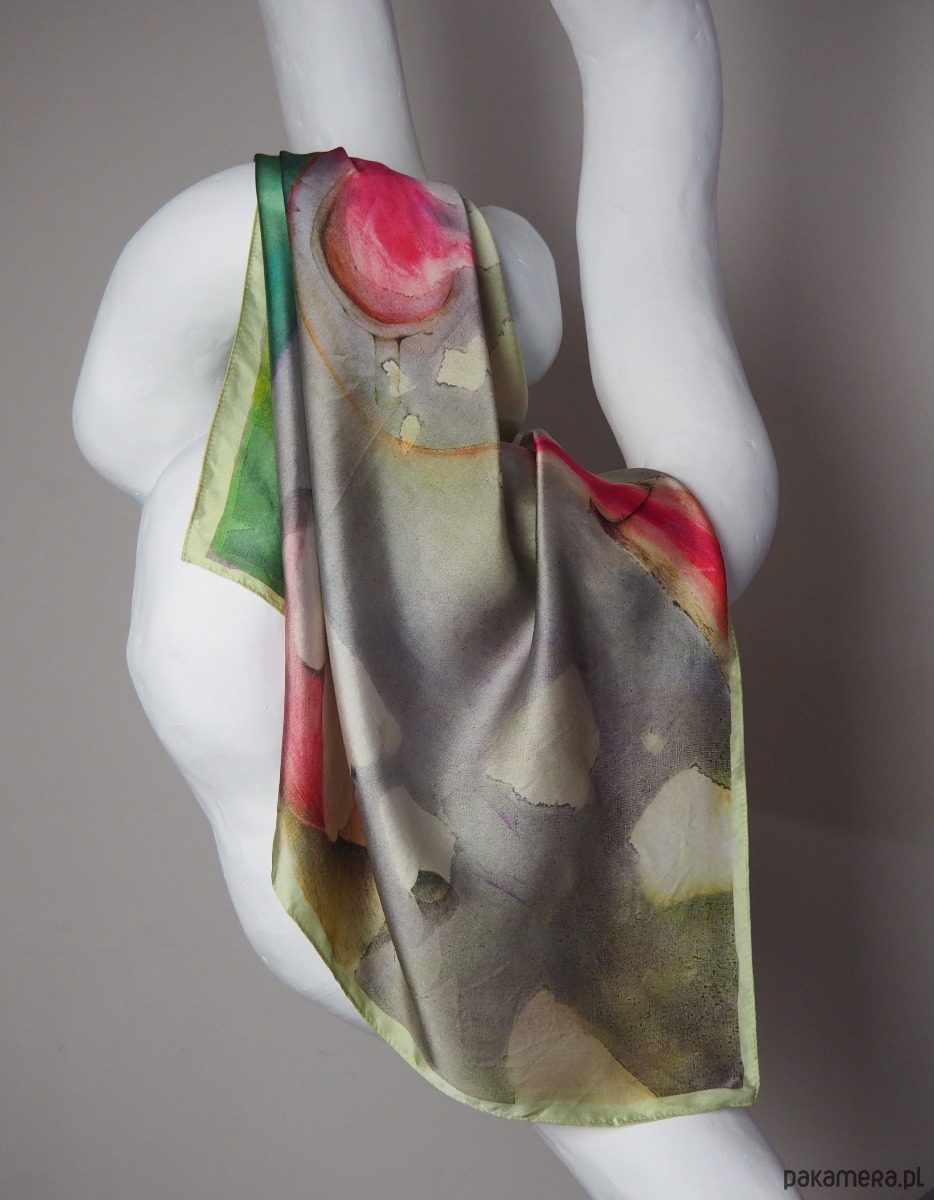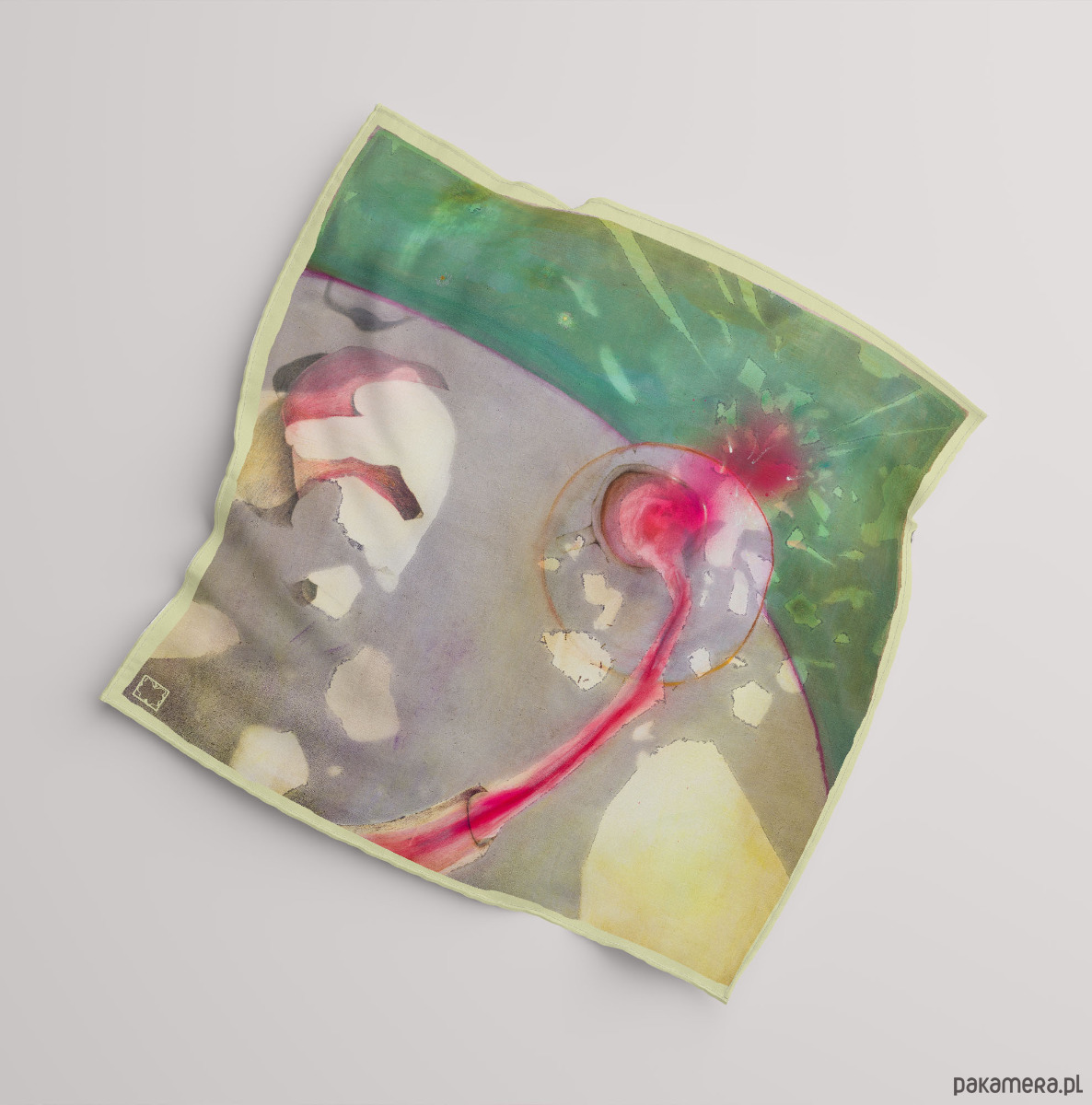 Apaszka wykonana w 100% z naturalnego jedwabiu, w formacie 70 × 70 cm. Jej wzór to fragment obrazu „Podwieczorek” – malarska kompozycja przeniesiona na tkaninę. Lekka i szlachetna, idealna jako subtelny akcent noszony na szyi, we włosach lub przy torebce.
