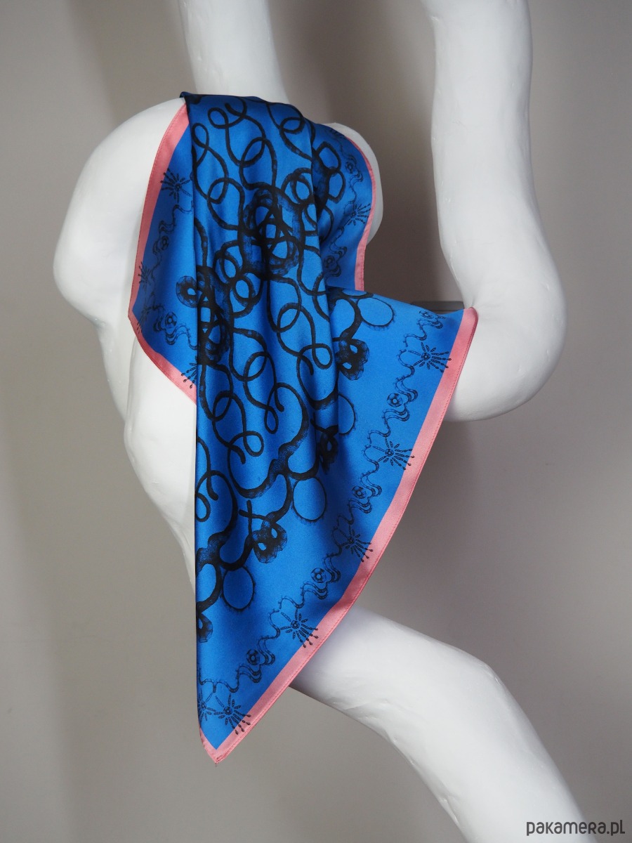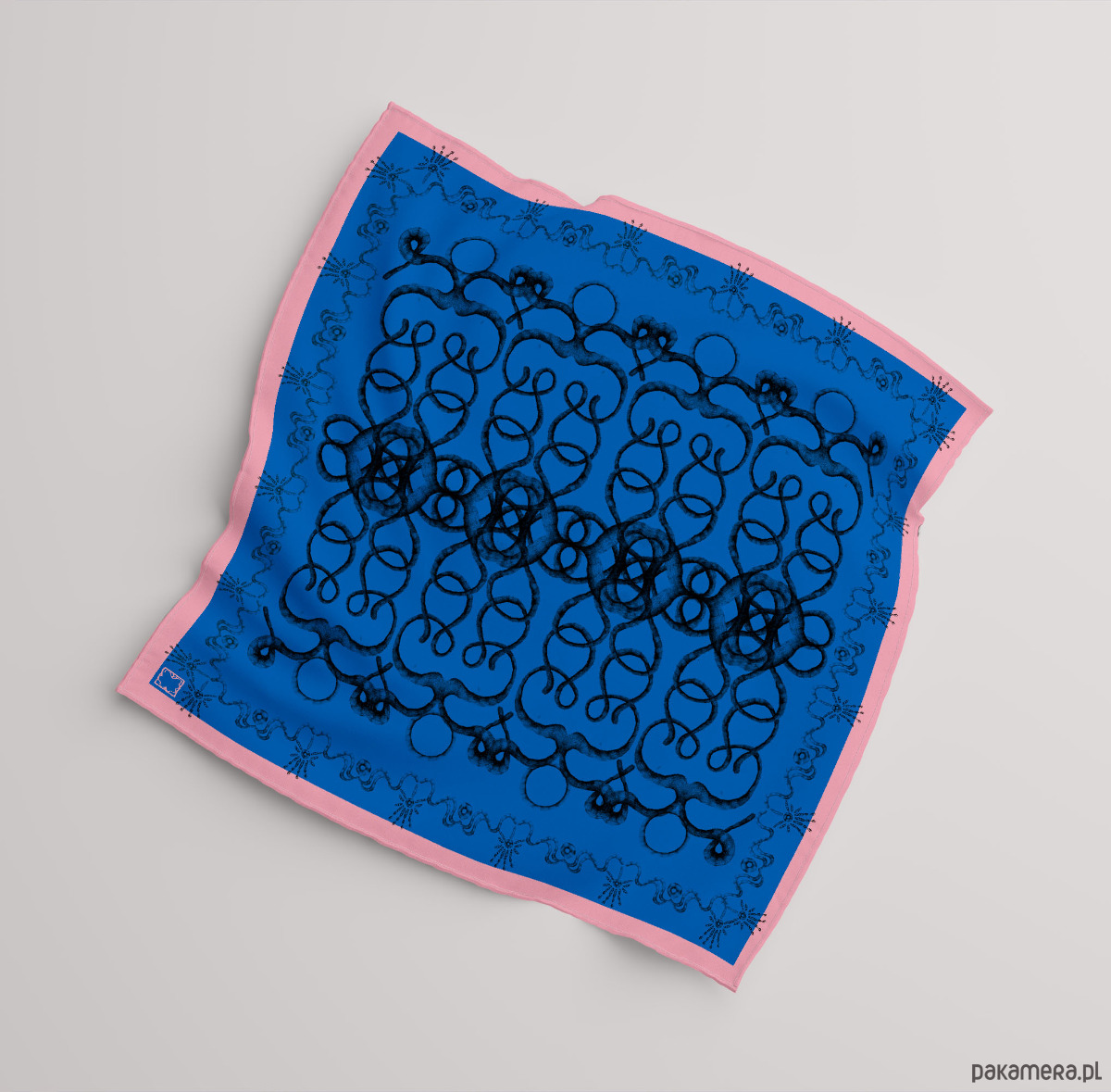 Apaszka w formacie 52 x 52 cm, uszyta z naturalnego jedwabiu. Zdobiona ręcznie rysowanym, ołówkowym wzorem, który nadaje jej unikalny charakter. Delikatna i uniwersalna – sprawdzi się jako dodatek noszony na szyi, we włosach lub przy torebce.
