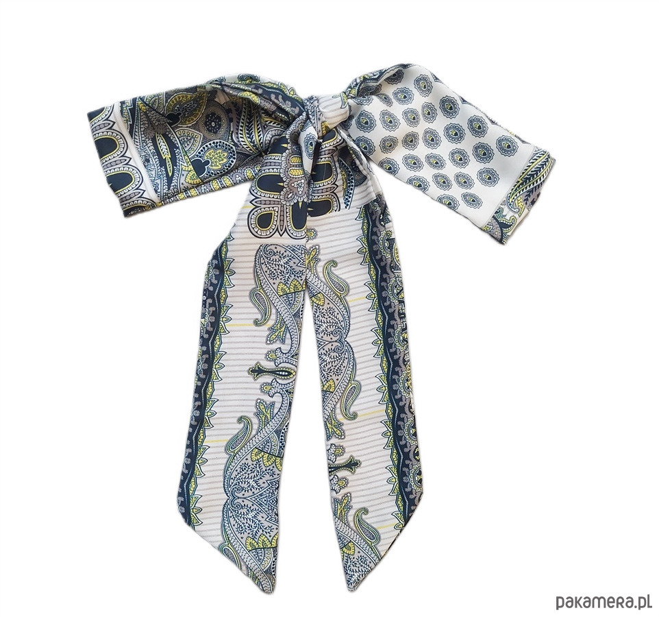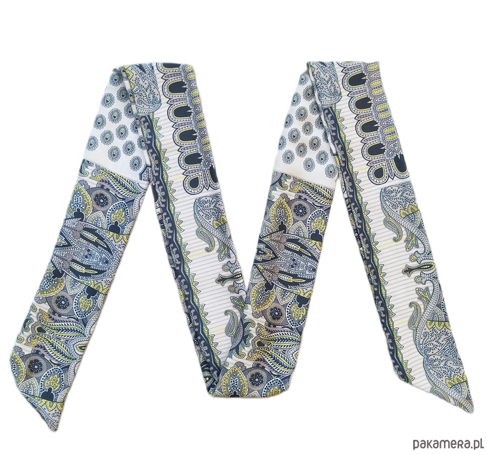 Apaszka w stylu twilly, ozdobiona klasycznym wzorem paisley, w odcieniach głębokiego granatu i subtelnego szarości. Motyw paisley, znany z orientalnych inspiracji dodaje apaszcze wyrafinowanego charakteru. Akcesorium to doskonale sprawdza się jako ozdoba zarówno do torebki, jak i na szyję, tworząc elegancki, ponadczasowy akcent. Wzór paisley w odcieniach granatu i szarości wprowadza subtelną harmonię i klasyczny szyk, idealny do stylizacji casualowych po bardziej formalne.
