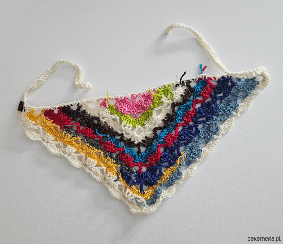 Jej trójkątny kształt pięknie układa się na głowie lub szyi, a wielobarwny, artystyczny wzór w stylu boho przyciąga spojrzenia i dodaje charakteru nawet najprostszej stylizacji. Połączenie kremowej bazy z energetycznymi akcentami kolorów sprawia, że każda sztuka ma w sobie radość i niepowtarzalność.
