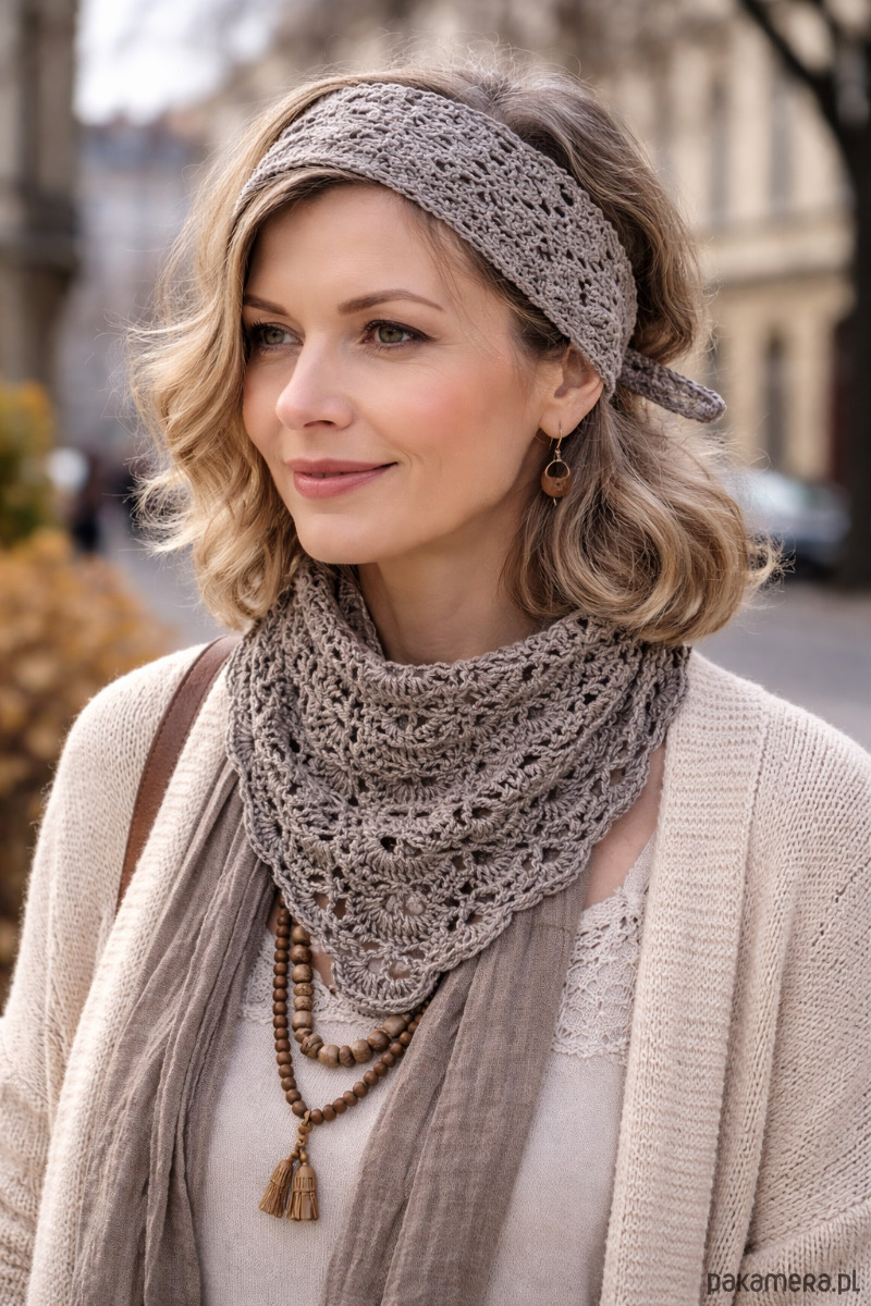 Ażurowy wzór sprawia, że apaszka jest przewiewna i bardzo komfortowa w noszeniu. Pięknie układa się zarówno na szyi, jak i na głowie – można ją nosić jako bandamę, chustę lub delikatny akcent do codziennych i letnich stylizacji.