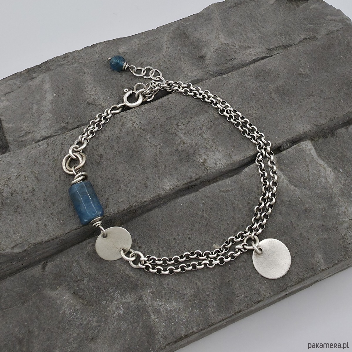 Modna, subtelna i kobieca bransoletka na co dzień i nie tylko. Wykonana w całości z oksydowanego srebra próby 925 oraz ciosanego walca apatytu wielkości ok. 1x0,7 cm. Mogę wykonać podobną bransoletkę z innymi kamieniami. Całkowita długość bransoletki to 18 cm plus regulacja 2,5 cm. W mojej galerii naszyjnik do kompletu. Ozdobnie zapakowana.