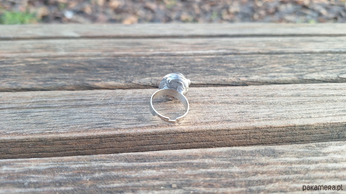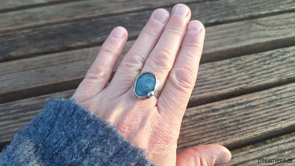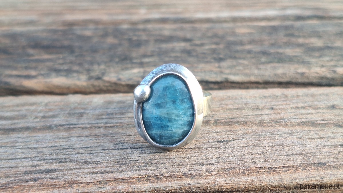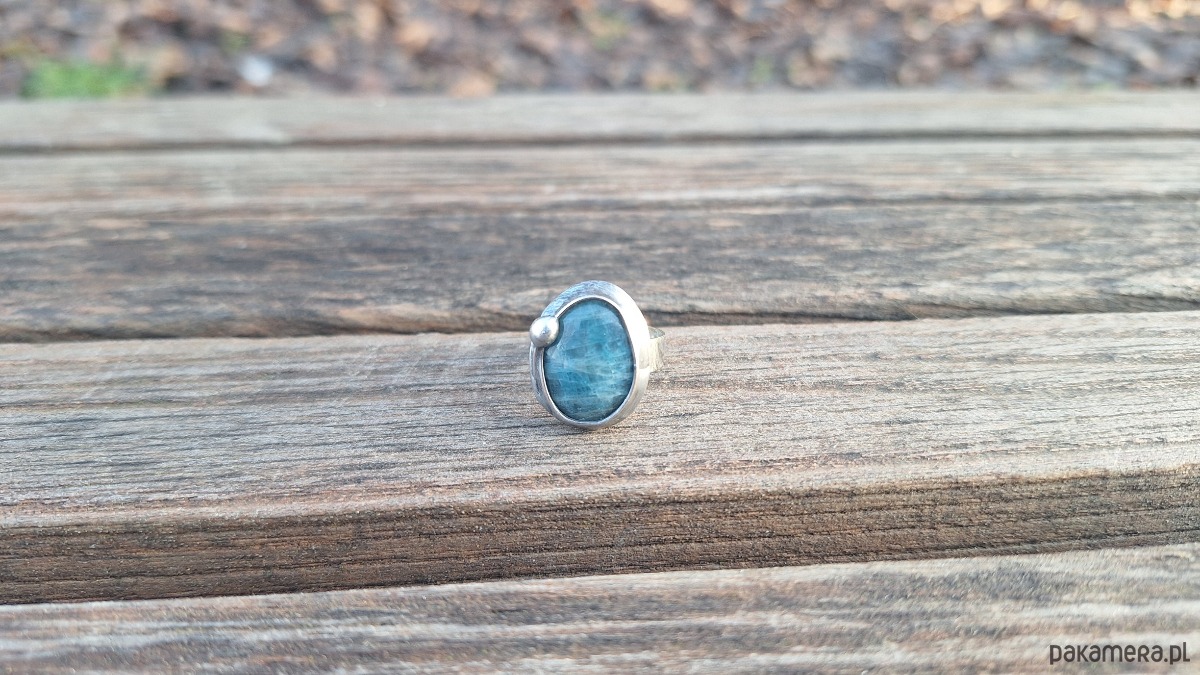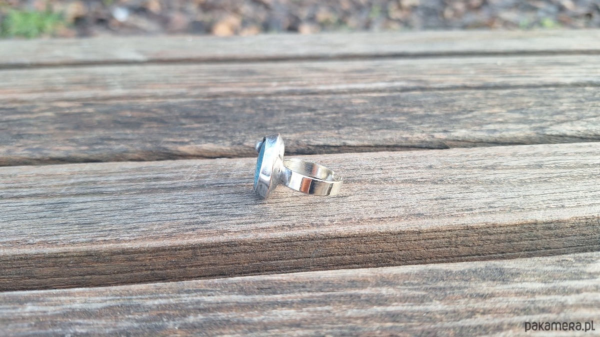 Pierścionek wykonany z miedzi, cyny i apatytu. Wymiary ok. 1.8 na 1.4 cm. Regulowany. Nie jest ciężki.