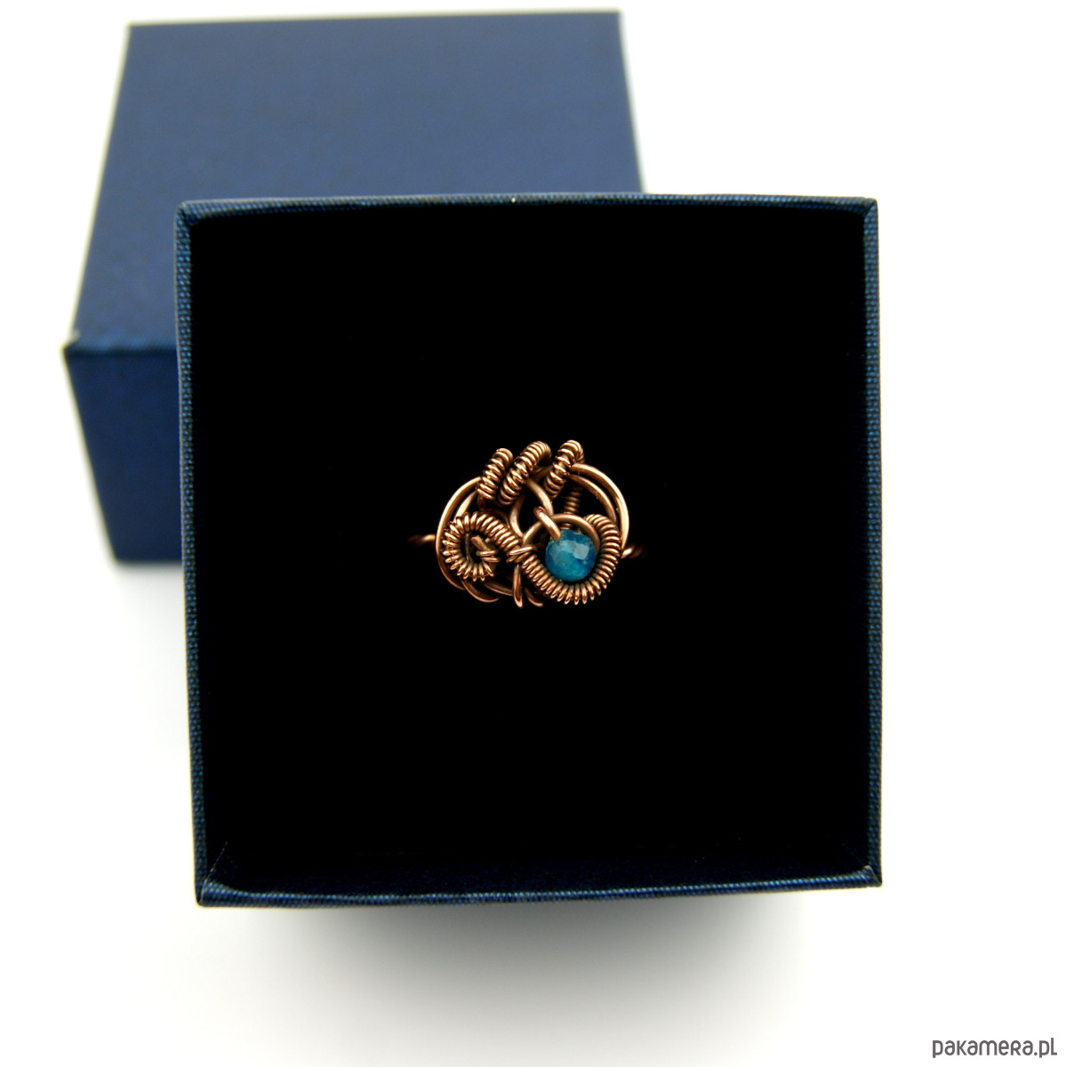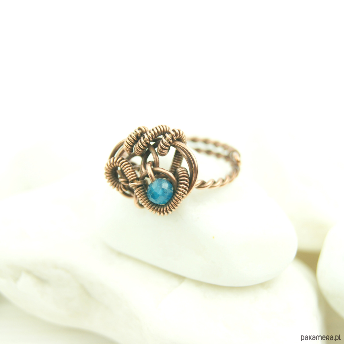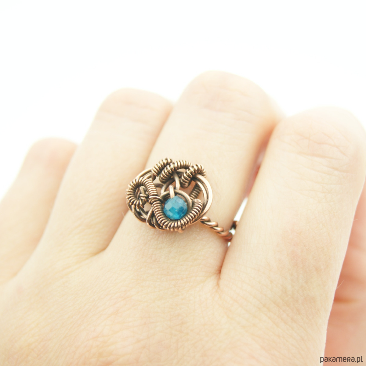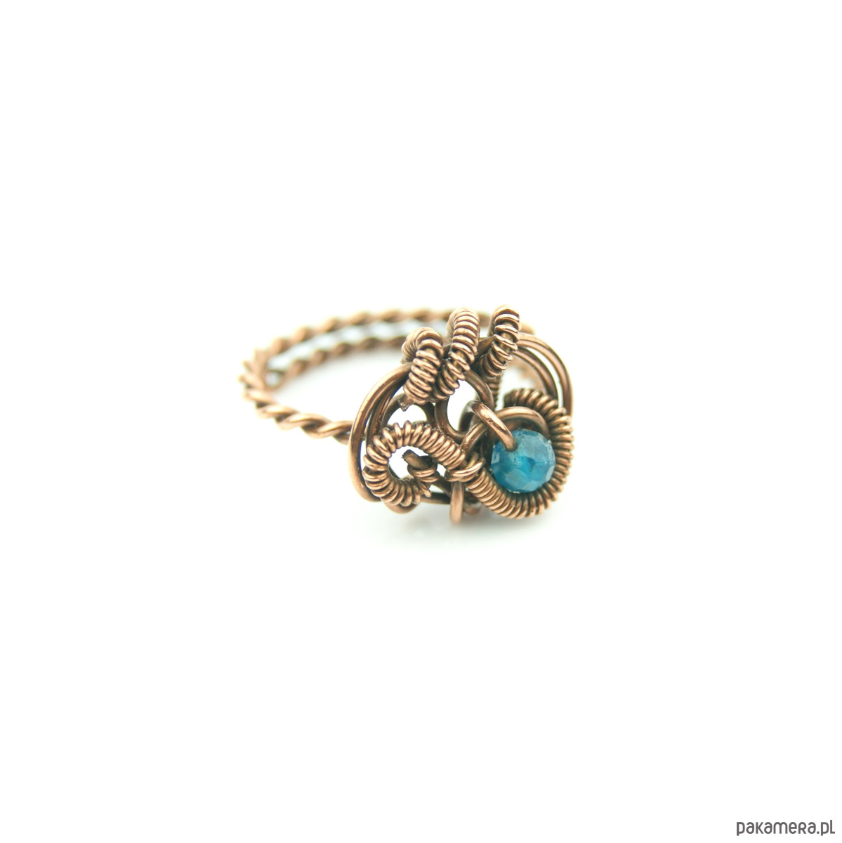Pierścionek wykonany w pracochłonnej technice wire wrappingu. Centralnym punktem jest tu apatyt, który został misternie opleciony miedzią. Pierścionek w uniwersalnym rozmiarze, możliwość regulacji.