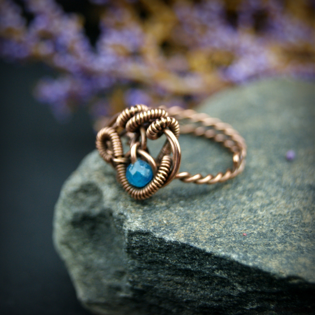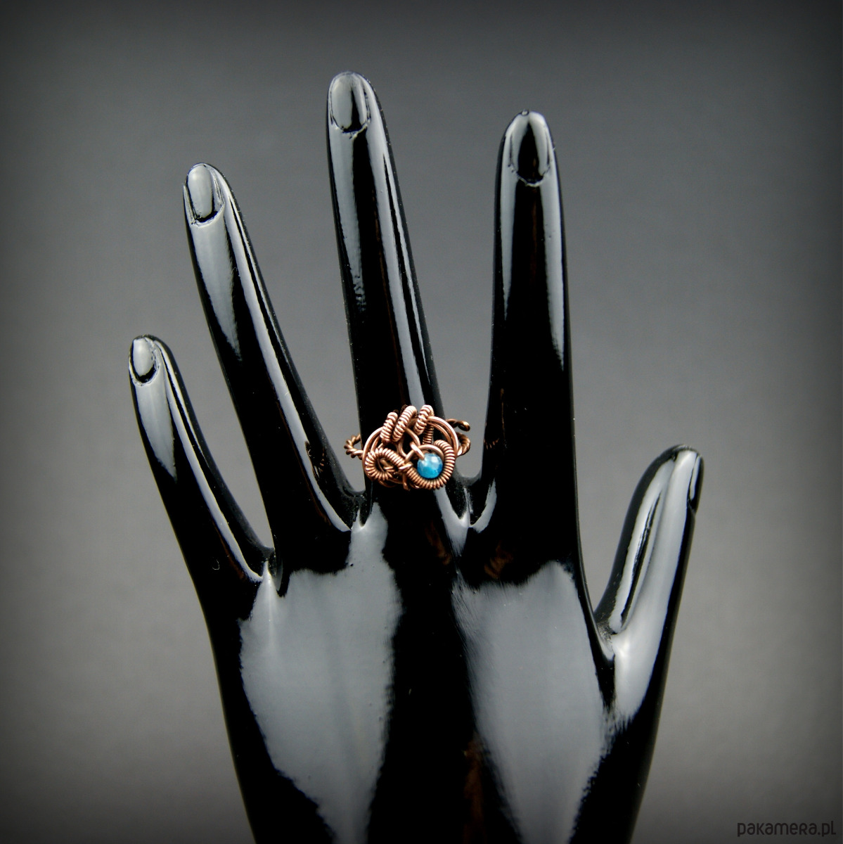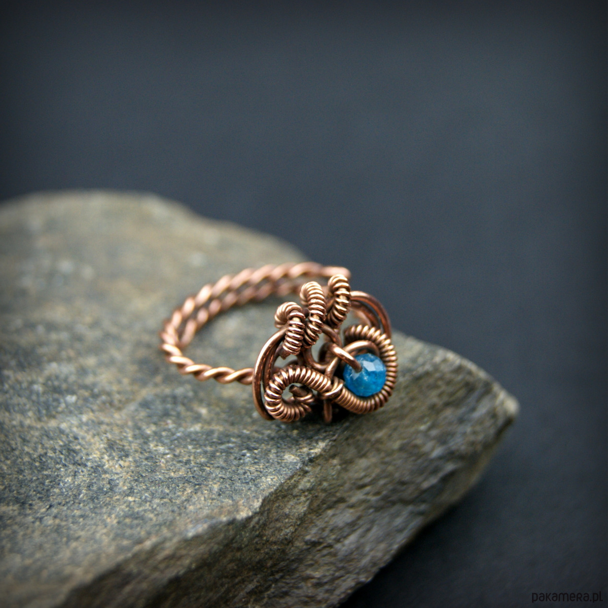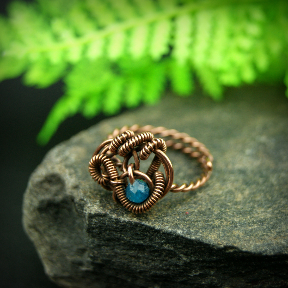 Pierścionek wykonany w pracochłonnej technice wire wrappingu. Centralnym punktem jest tu apatyt, który został misternie opleciony miedzią. Pierścionek w uniwersalnym rozmiarze, możliwość regulacji.