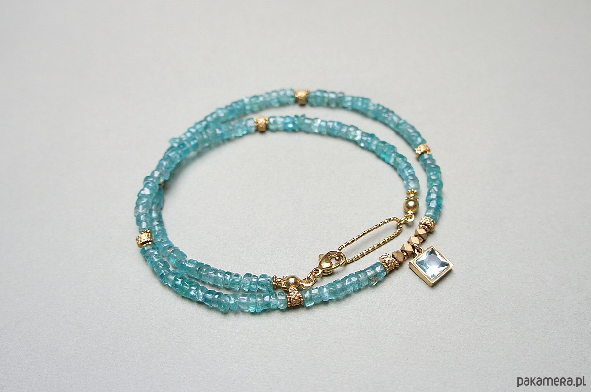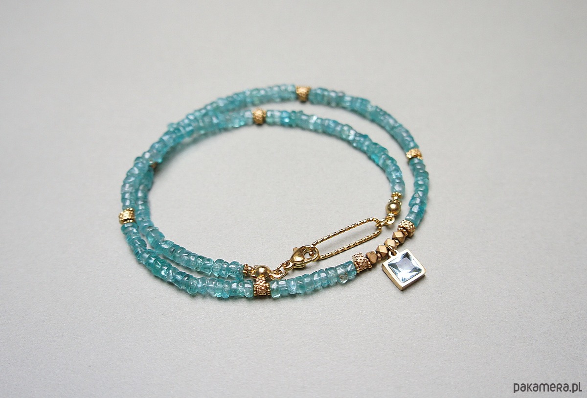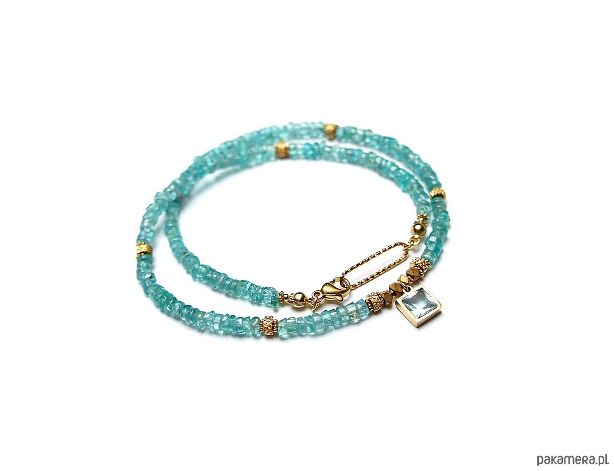 Krótki, delikatny naszyjnik wykonany w całości z pozłacanej stali szlachetnej oraz naturalnych, szlachetnych kamieni - talarki nieregularnego apatytu [4,5 x 2-3mm], przekładek z hematytu [3 x 2mm] oraz zawieszki z cyrkonią. Naszyjnik o długości ok. 42cm.