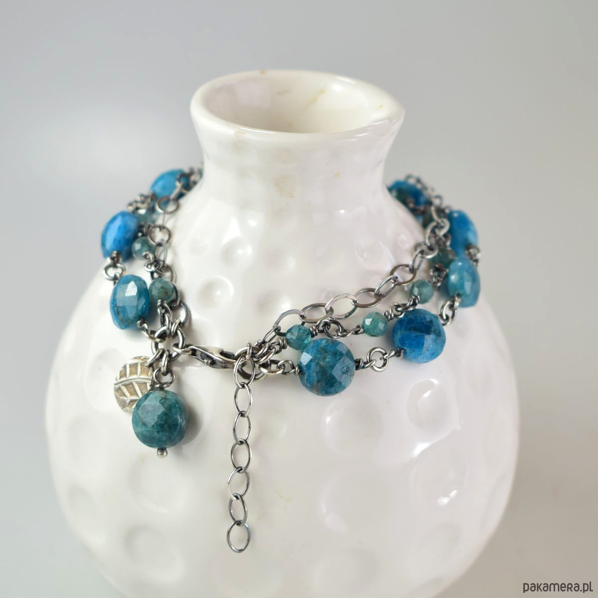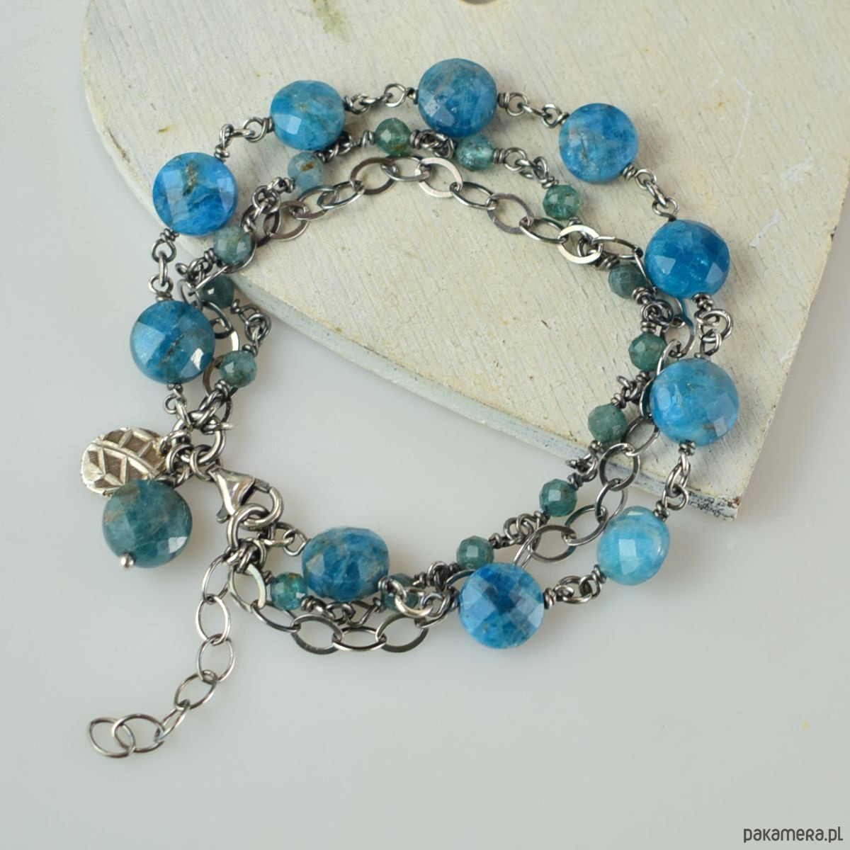 Bransoletka wykonana w całości ze srebra (próba 925) z apatytem. Całość została zoksydowana (przyciemniona) i wypolerowana. Długość regulowana 20,5 - 24 cm. Biżuteria zostanie ozdobnie zapakowana.